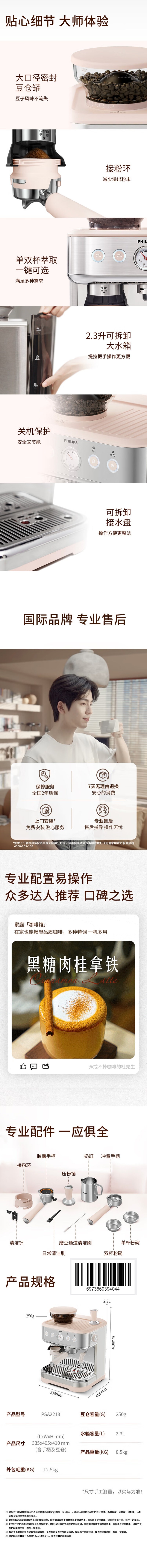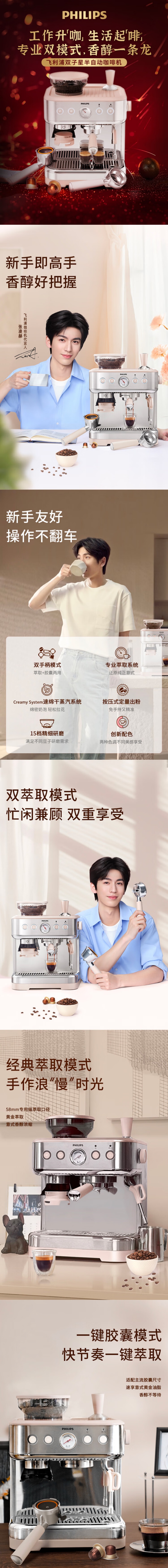 飞利浦(PHILIPS)双子星系列张凌赫推荐意式半自动咖啡机PSA2218/50 单位:台 郁金香粉