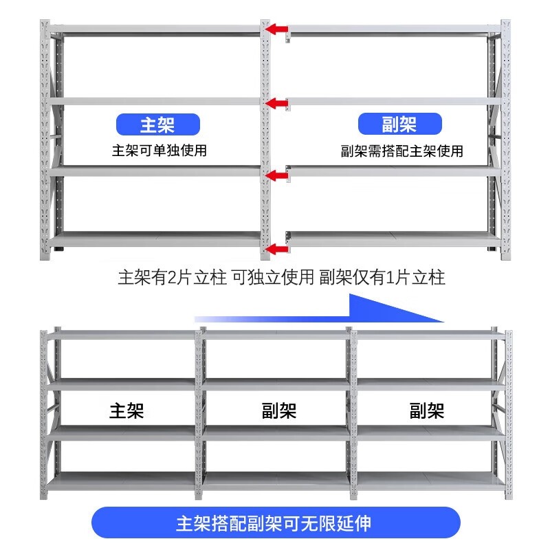 维仕蓝货架仓储货架重型厂房仓库货架-灰白色四层副架2000*500*3200mm每层承重500kg张 浅灰色