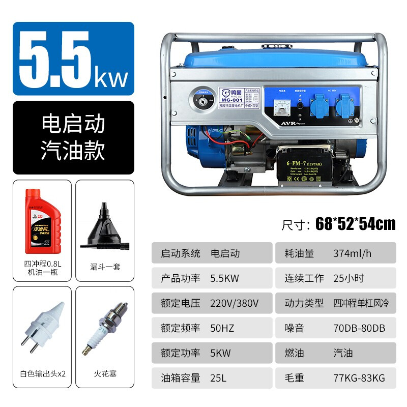 鸣固5.5kw汽油发电机220V/380V家用户外低噪发电机组应急便携式手启动(单位:台) 蓝色
