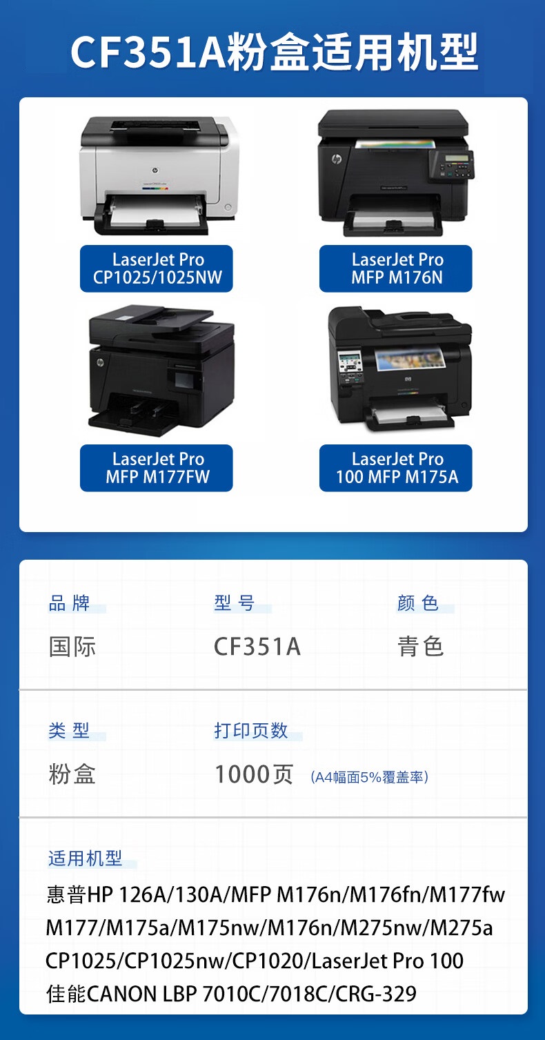 国际 CF351A 蓝色大容量粉盒 1000页适用惠普cp1025 m175a m176n单位:支 蓝色