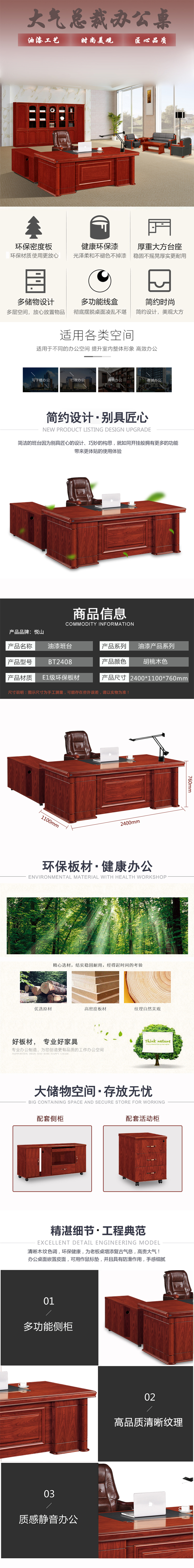 悦山 传统油漆班台主管桌中纤板贴皮胡桃木皮色含侧柜 2400*1100*760*1张 胡桃木色