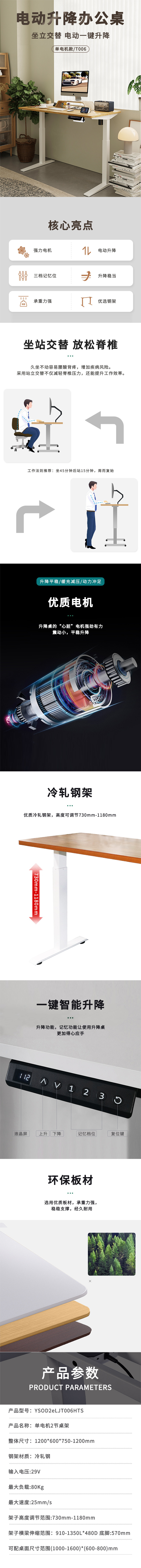 悦山 电脑桌电动升降桌办公桌 单电机款 1200*600*750-1200mm*1张 原木色
