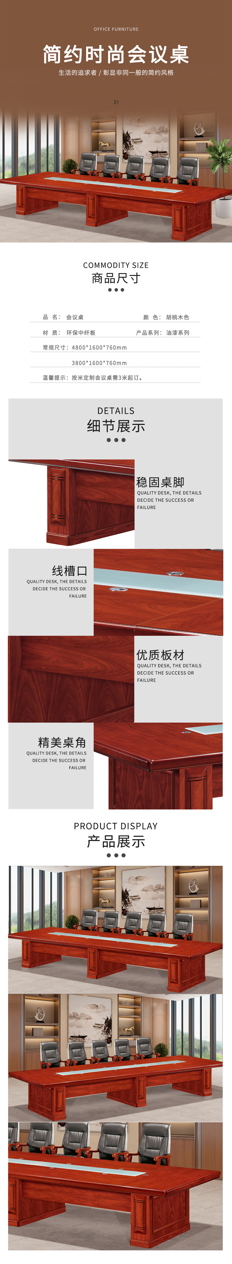 悦山 会议桌办公大型油漆会议台贴木皮开会洽谈长桌 胡桃木色 4800*1600*760mm*1张