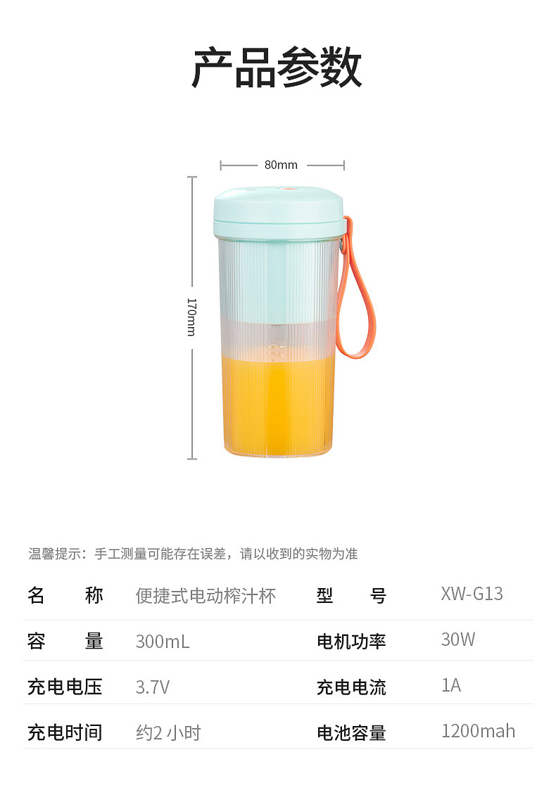 帅康sacon便携式电动果汁杯XW-G13(单位:台) 水蓝色