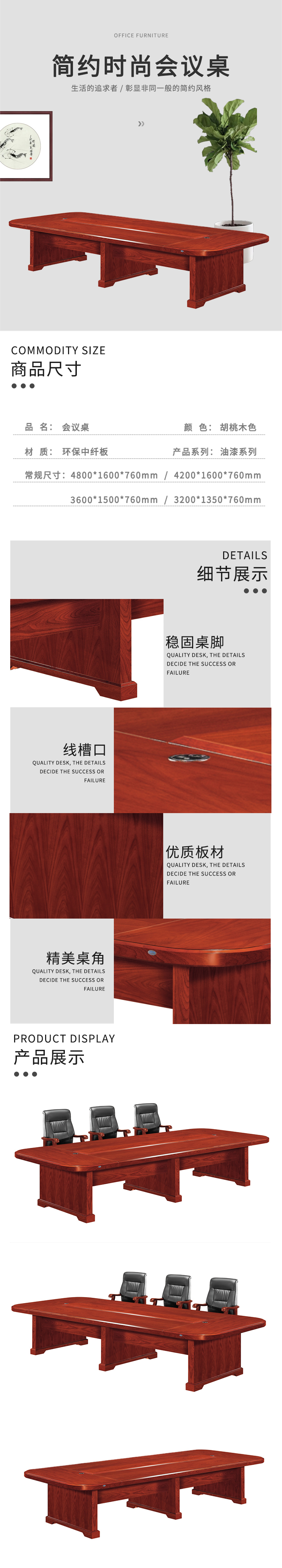 悦山 油漆会议桌商务洽谈长桌贴木皮大型会议台 胡桃木色 3600*1500*760mm*1张