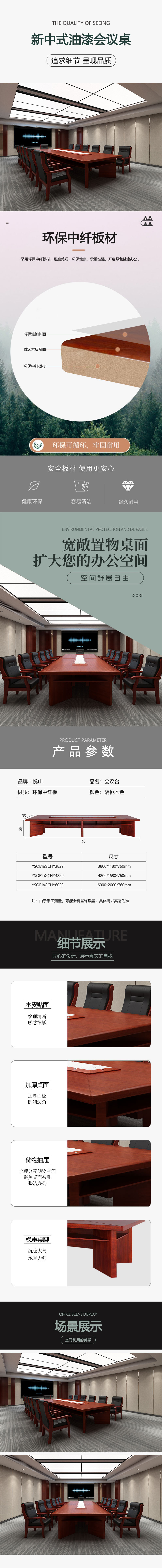 悦山 大型会议桌长条简约商务开会桌 胡桃木色 4800*1680*760*1张