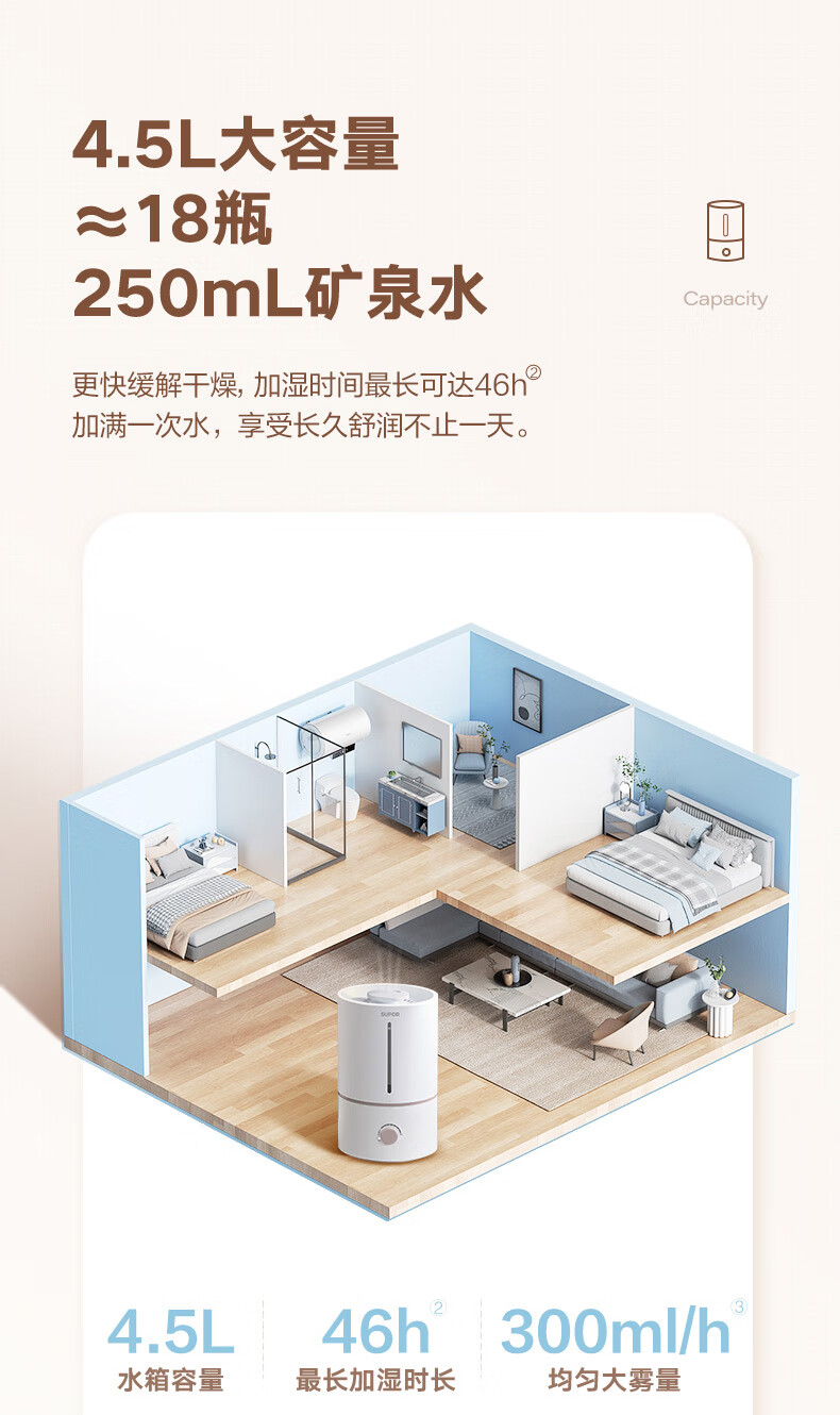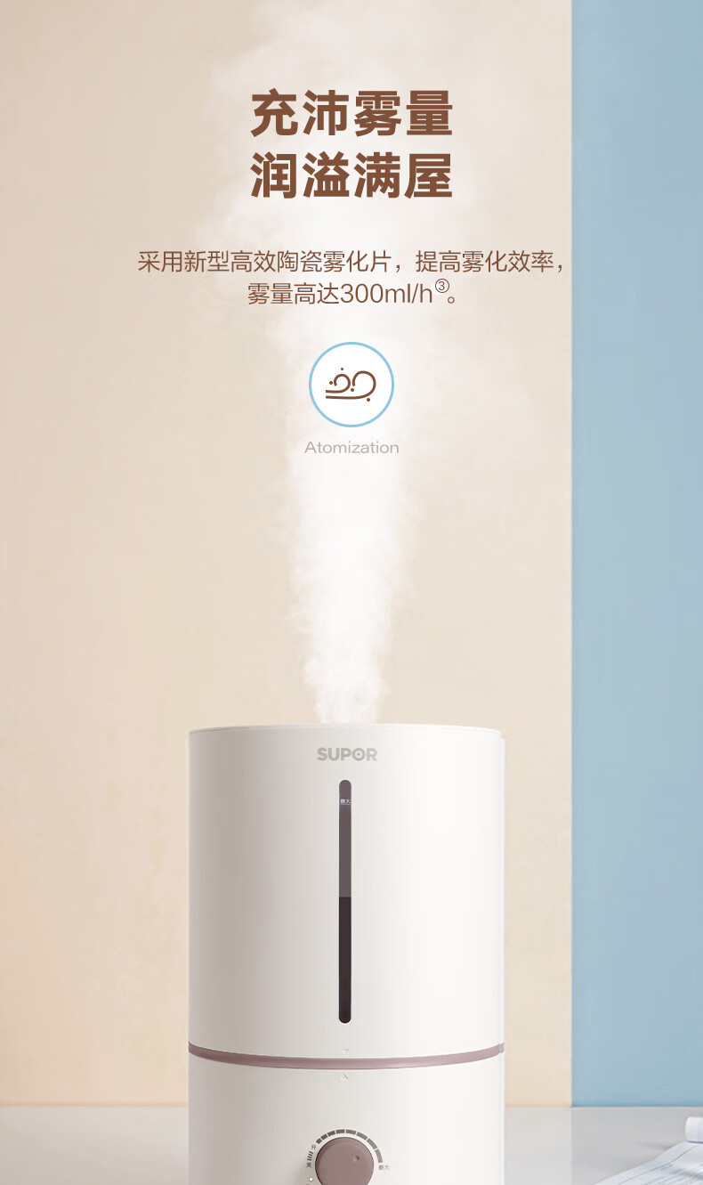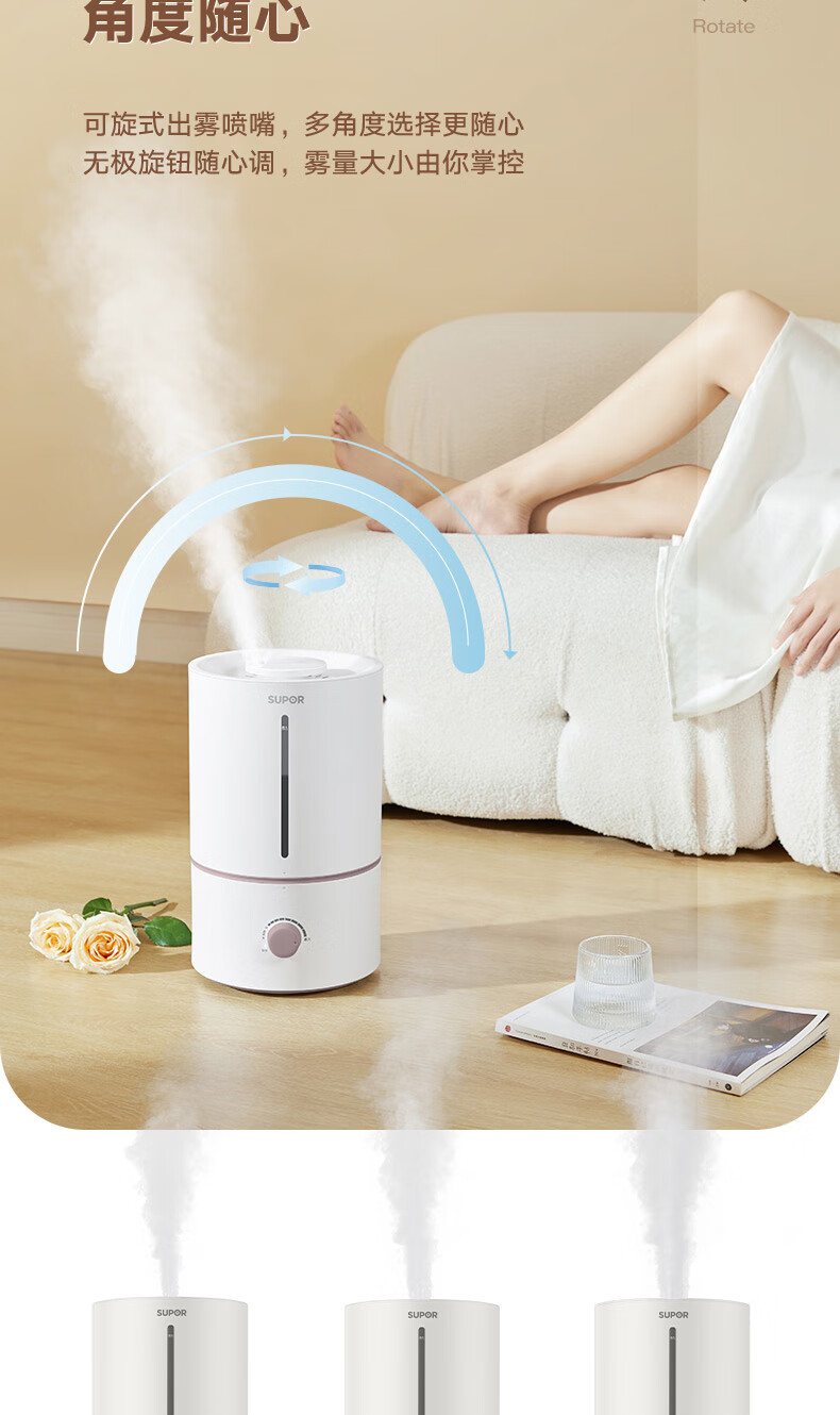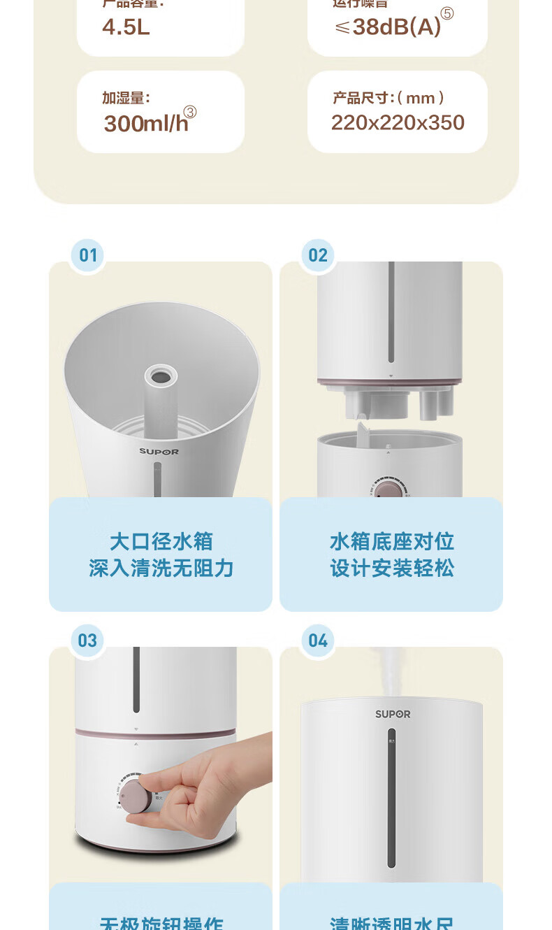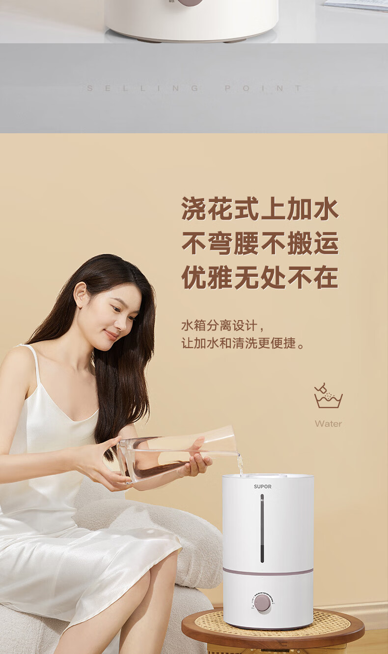 苏泊尔(SUPOR)ZMD安心系列加湿器 银离子材质低音低噪4.5L大容量HHTW-81A-300(单位:台) 本白色