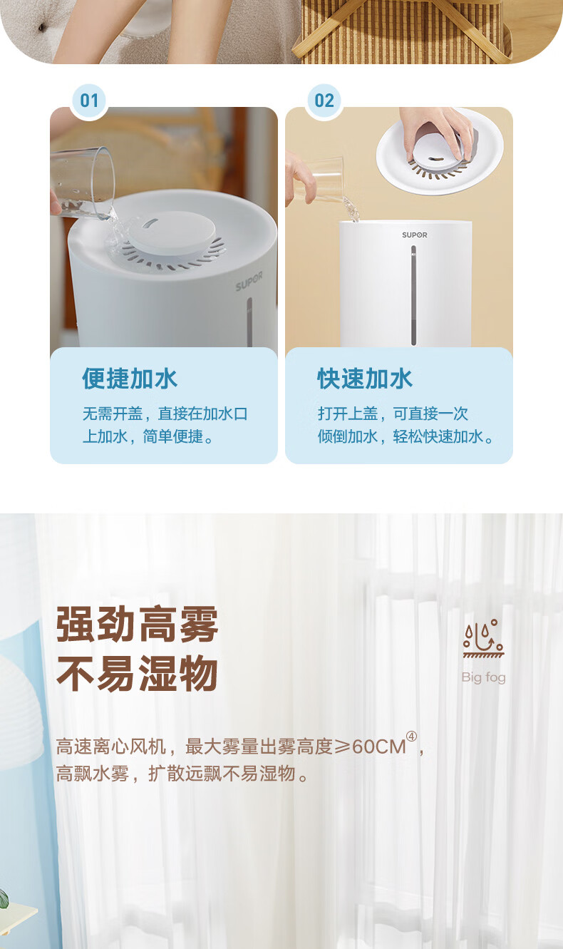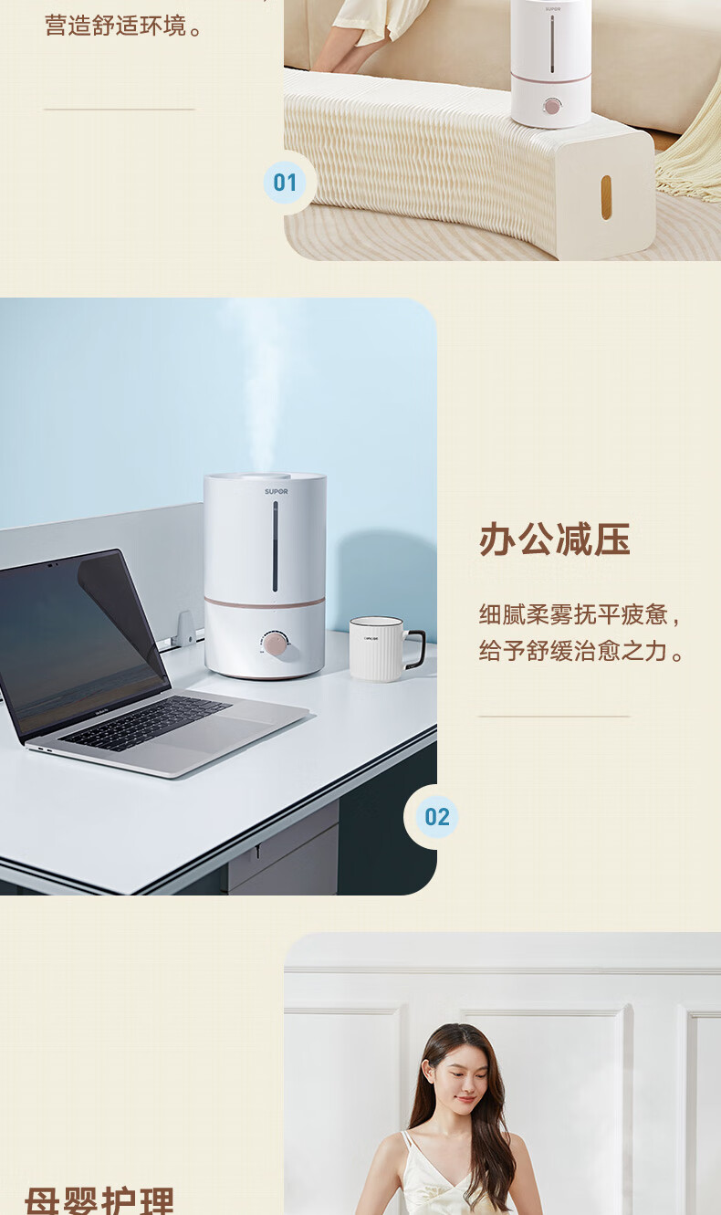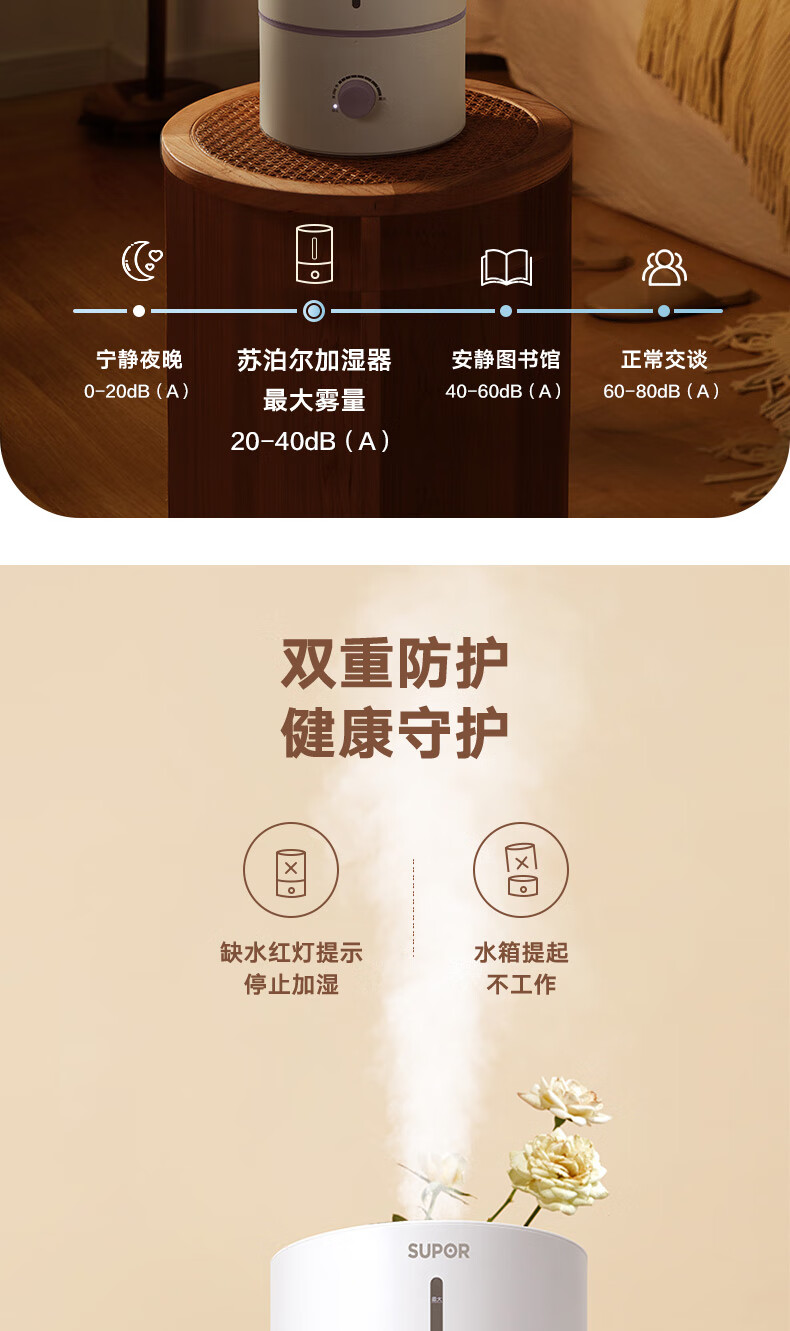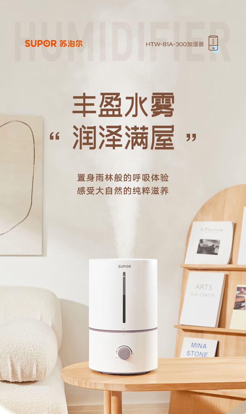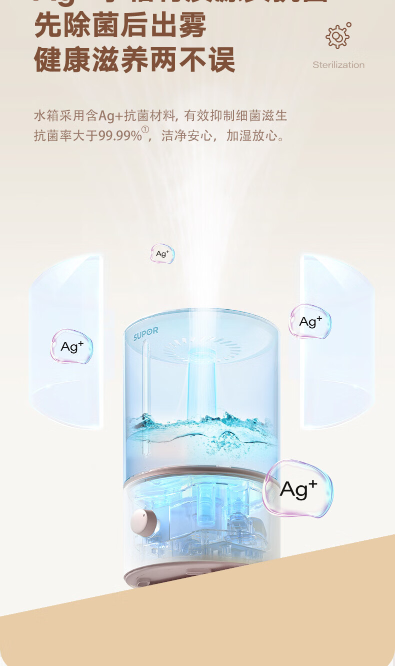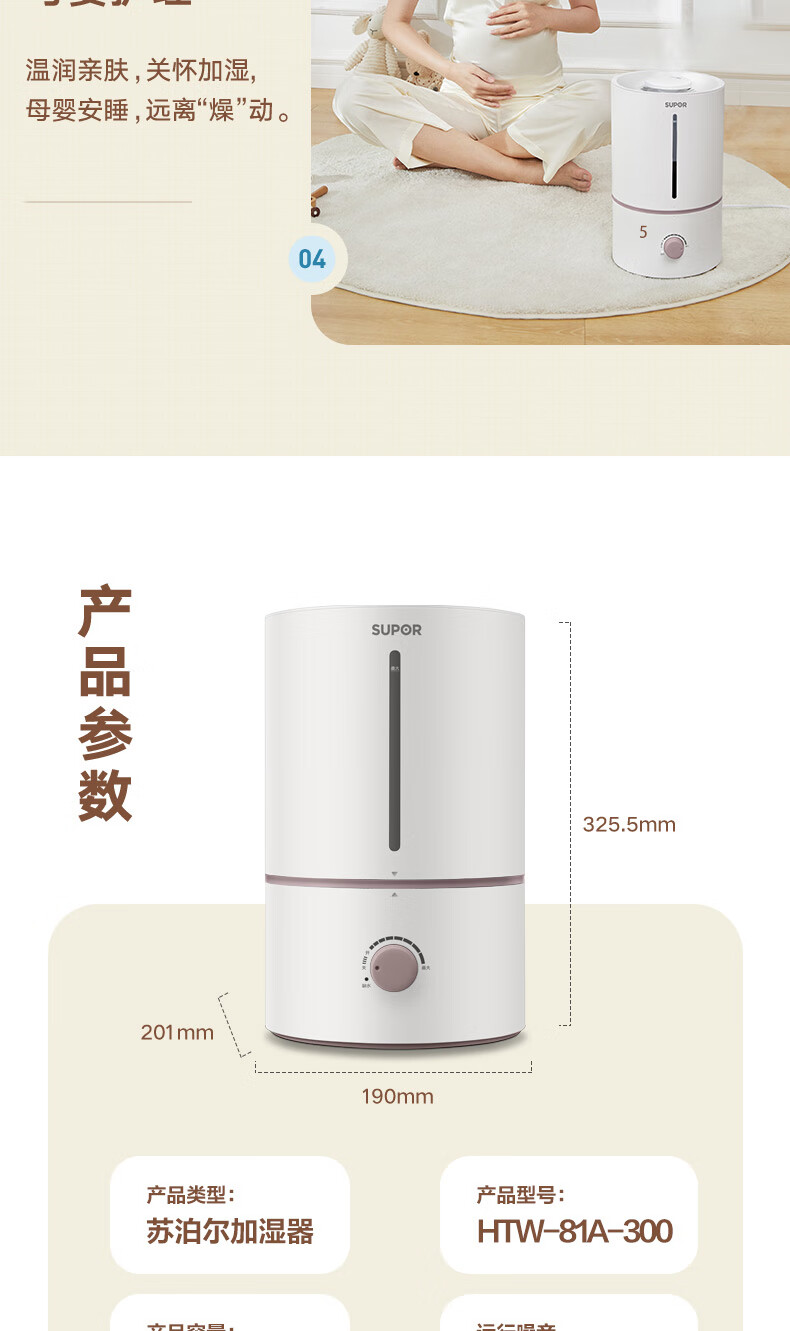 苏泊尔(SUPOR)ZMD安心系列加湿器 银离子材质低音低噪4.5L大容量HHTW-81A-300(单位:台) 本白色