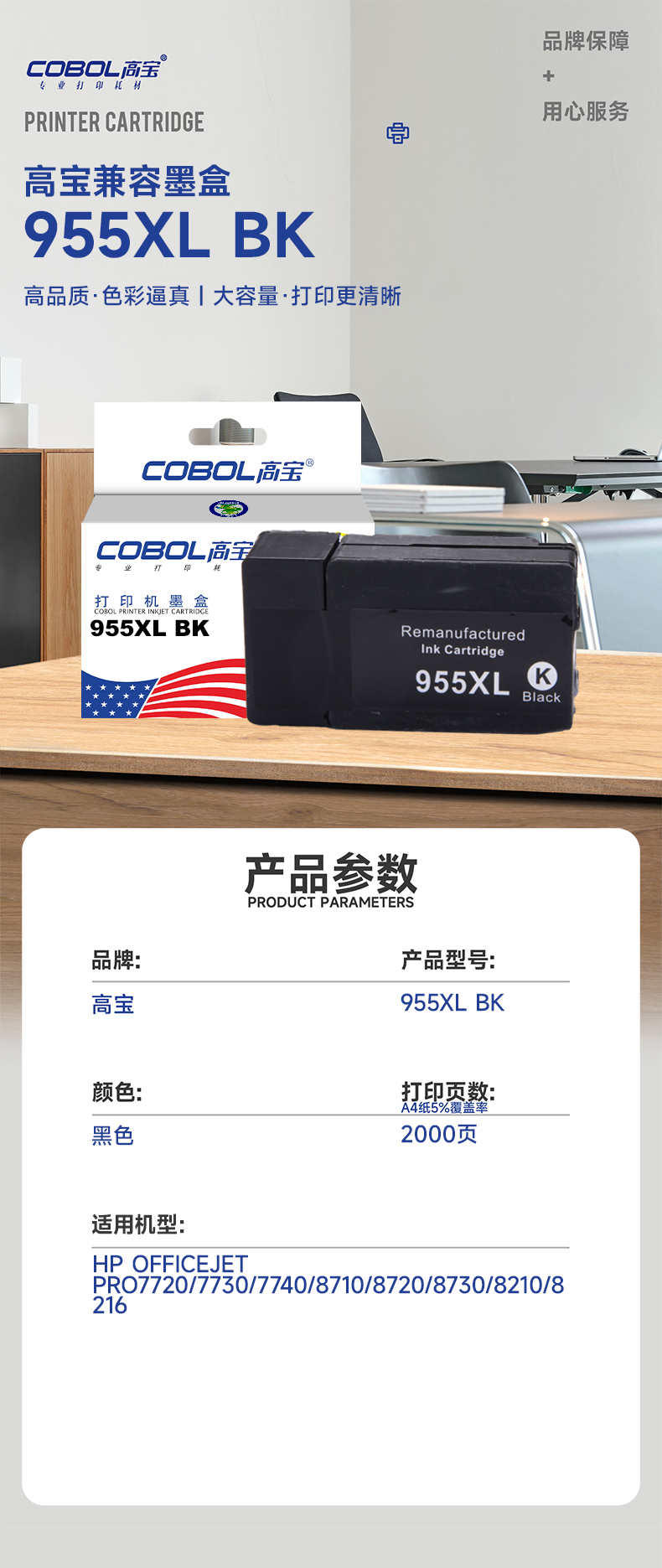 高宝 COBOL 955XL BK 墨盒适用惠普7720/7730/7740/8710/8720/8730/8210/8216打印机1支 黑色
