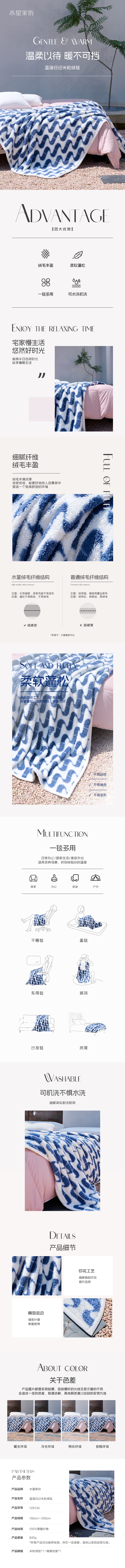 水星家纺 DH蓝海日记米粒绒毯 150cm×200cm 129134 单位:床 蓝色