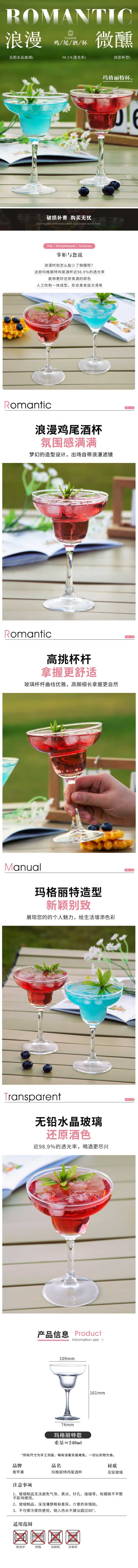 青苹果威斯顿高脚杯玛格丽特鸡尾酒杯240ml*6只装威士忌杯 透明