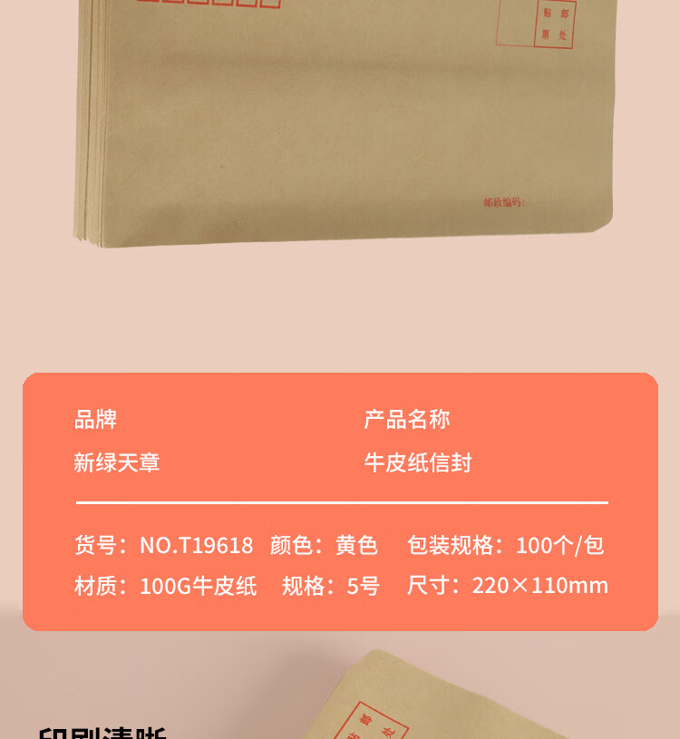 天章 (TANGO) T19618 5号 220*110mm 100G 100个/包 牛皮纸信封 牛皮黄(单位:包)