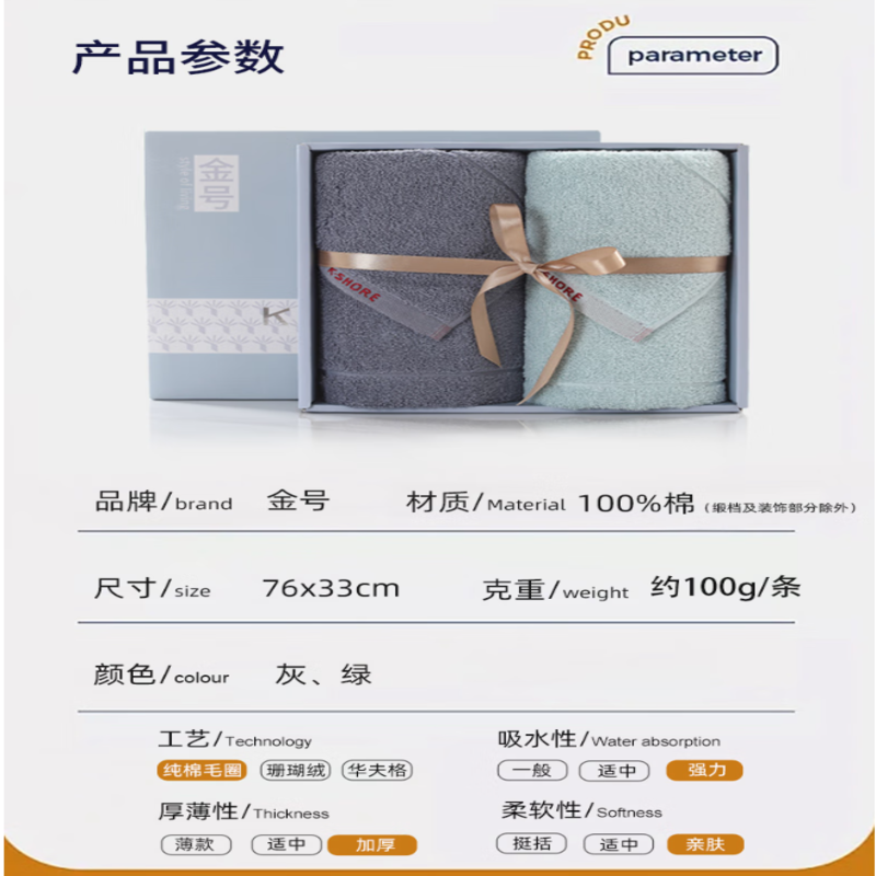 金号(KING SHORE) 7A抗菌纯棉毛巾礼盒2条装 GA1784 毛巾尺寸:76*33cm*2 混色(单位:盒)