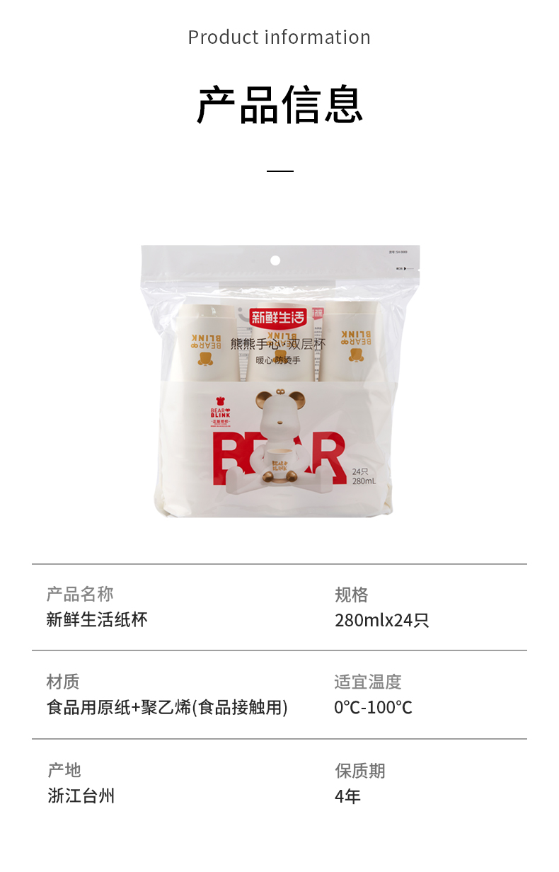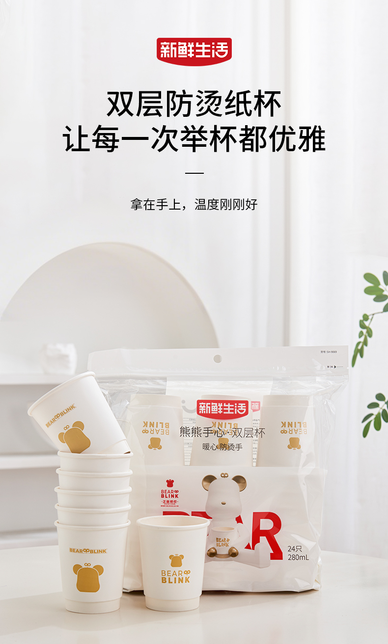 新鲜生活 一次性杯子熊熊杯 SH-9069 24只 白色(单位:包)