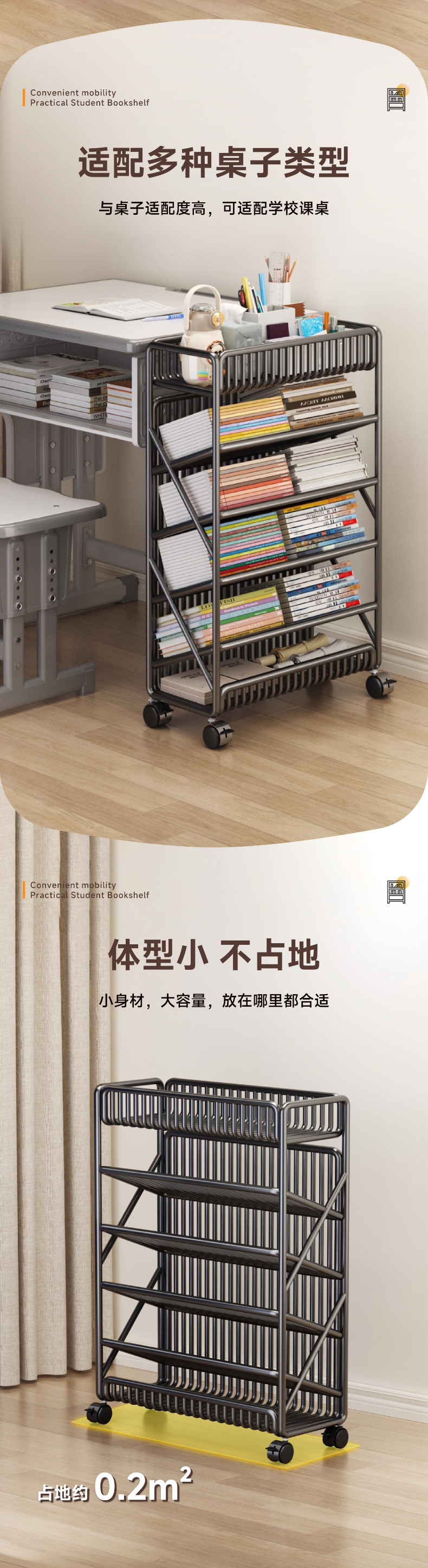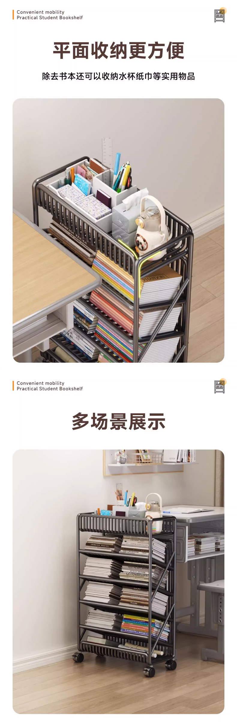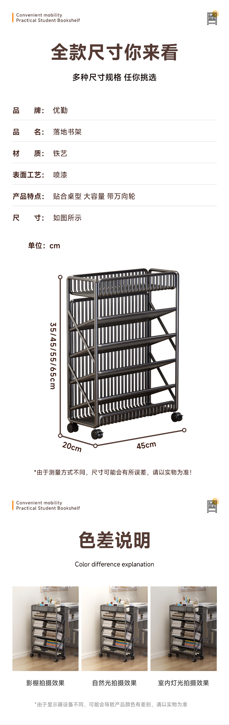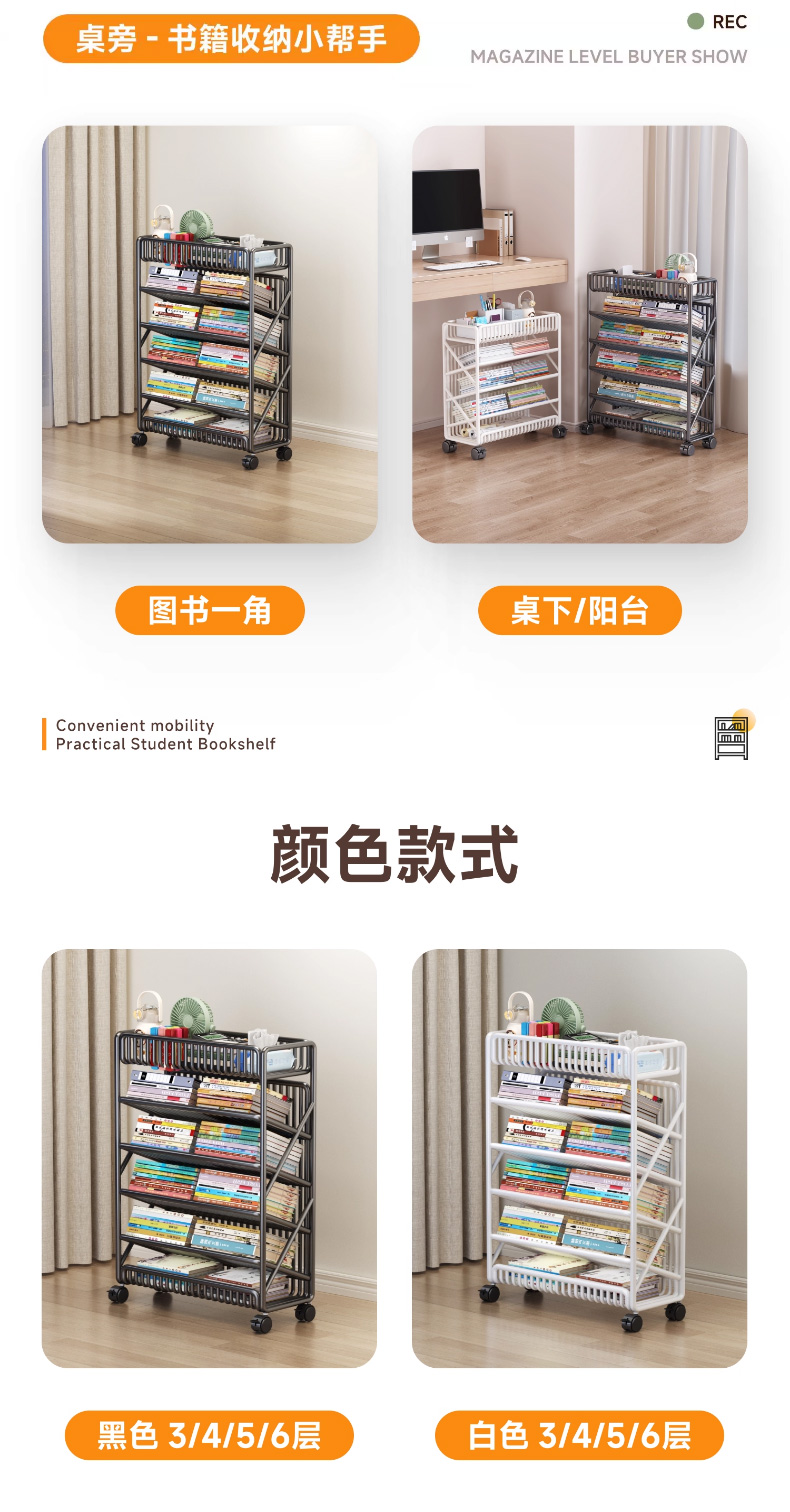 优勤(YOUQIN) TE加粗落地书架6层 1401-15Y 45*20*65cm/带轮带侧杆 黑色(单位:个)