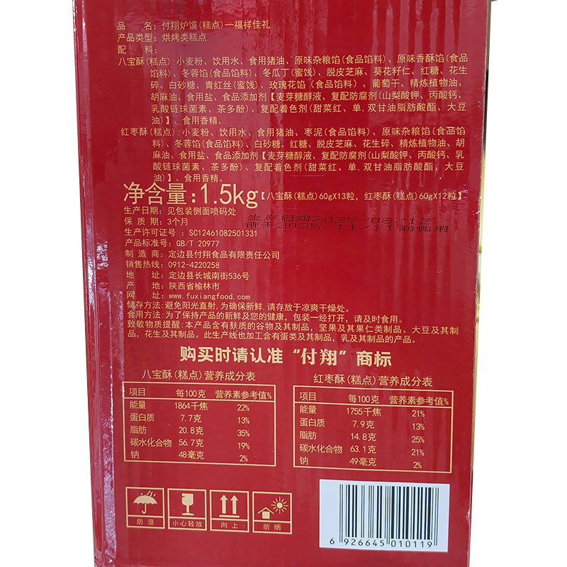 付翔 手工炉馍 福祥佳礼 1.5kg (八宝酥60g*13粒 红枣酥60g*12粒) 口味 混色(单位:盒)