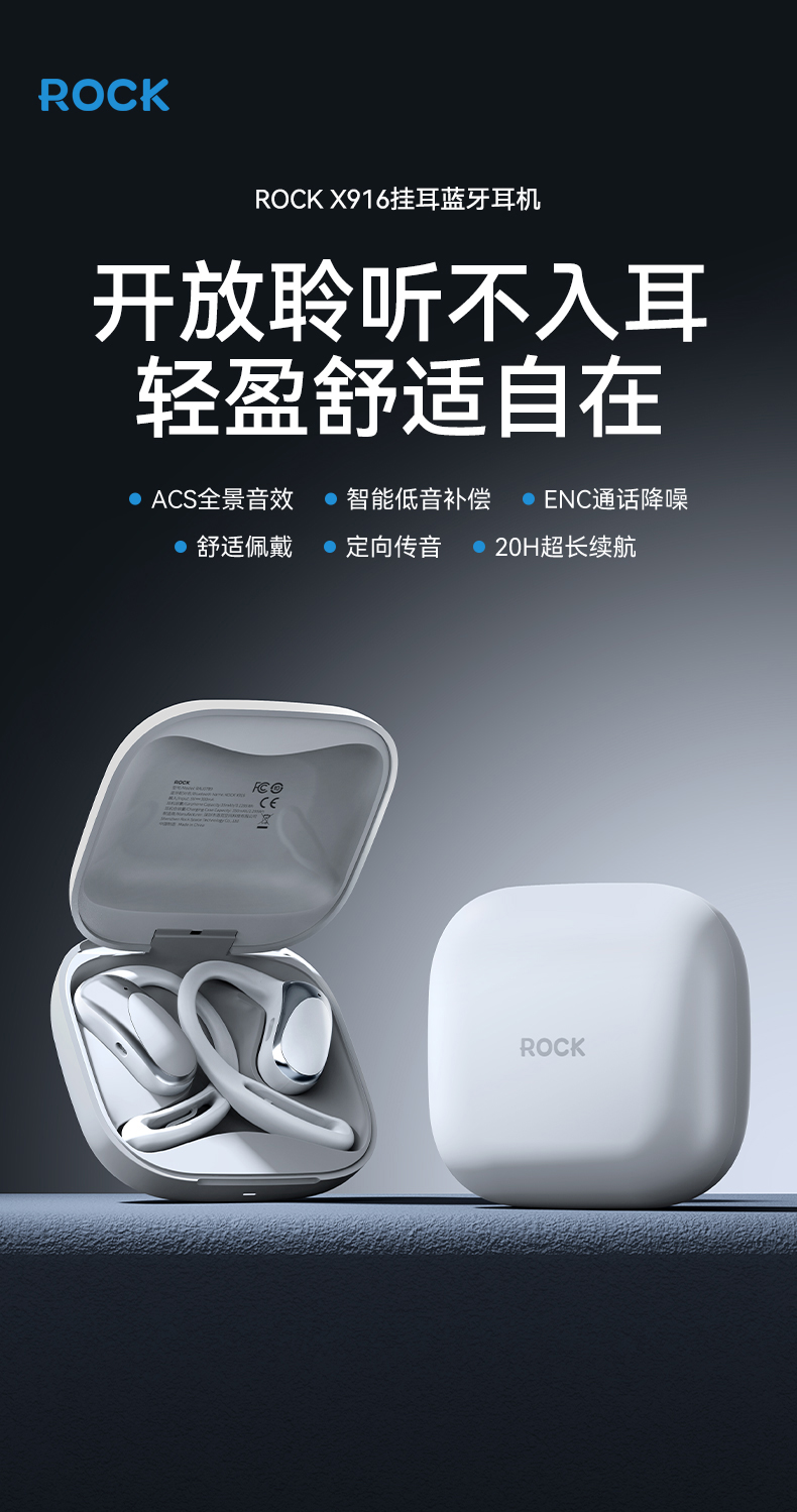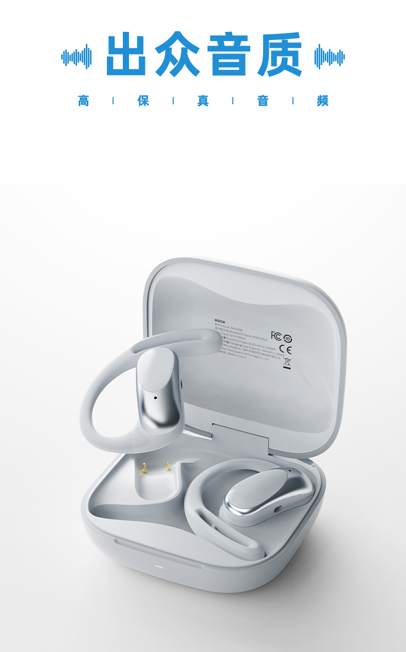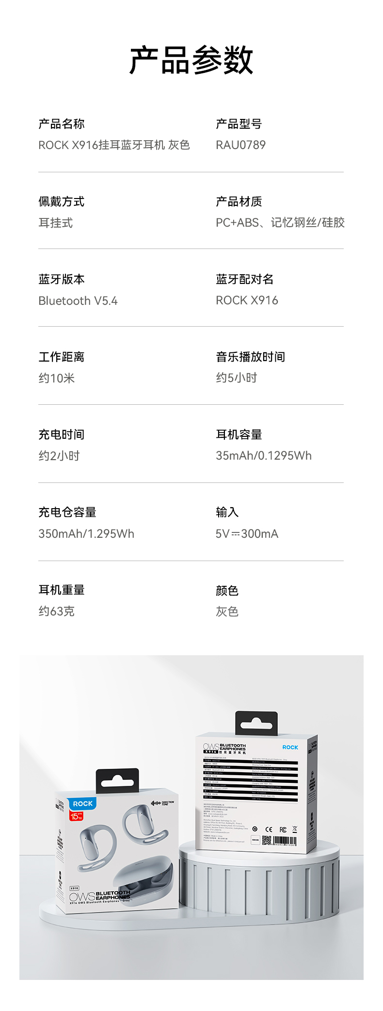 ROCK X916 挂耳蓝牙耳机 RAU0789 充电仓容量:350mAh 灰色(单位:付)