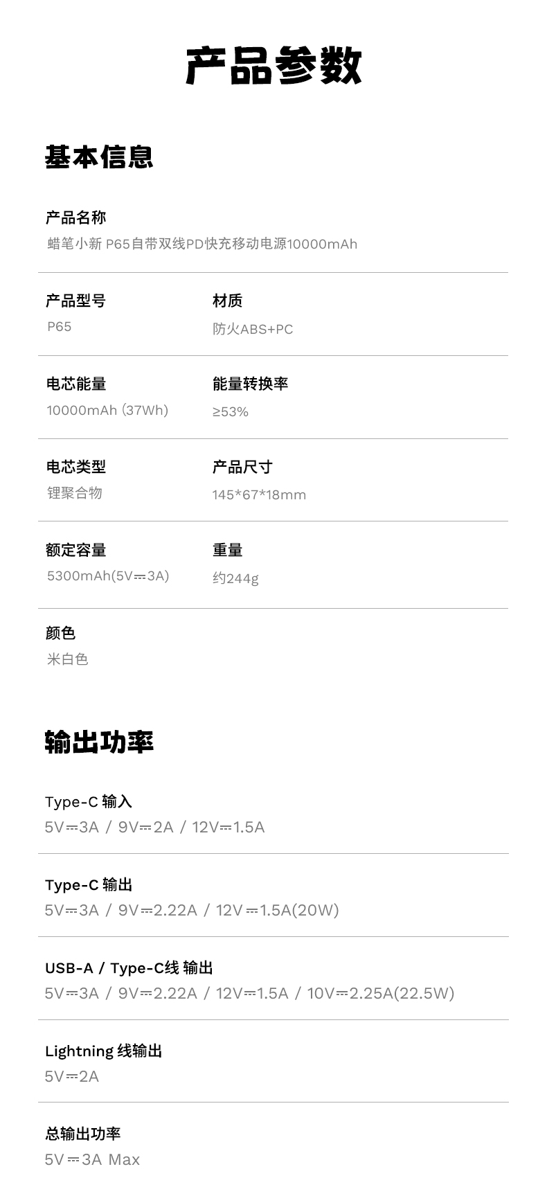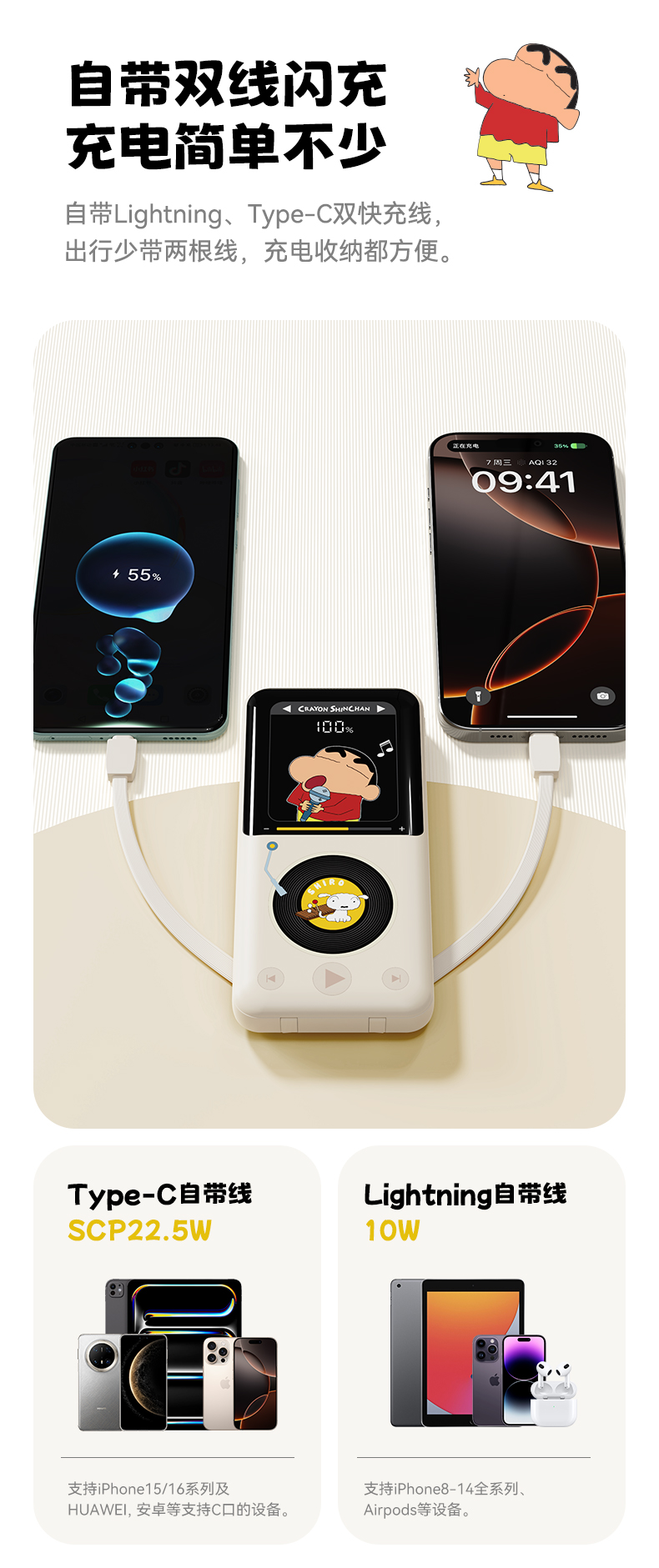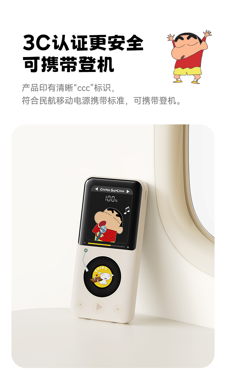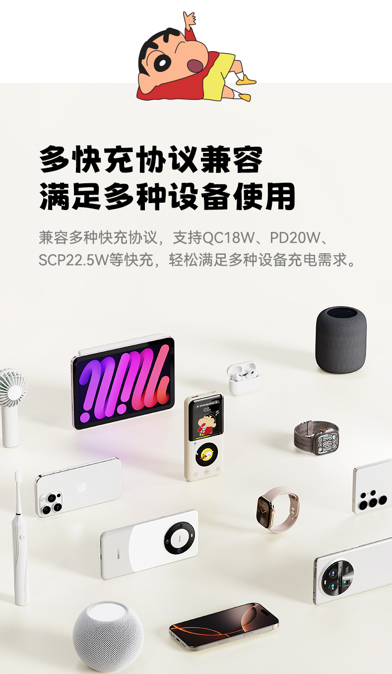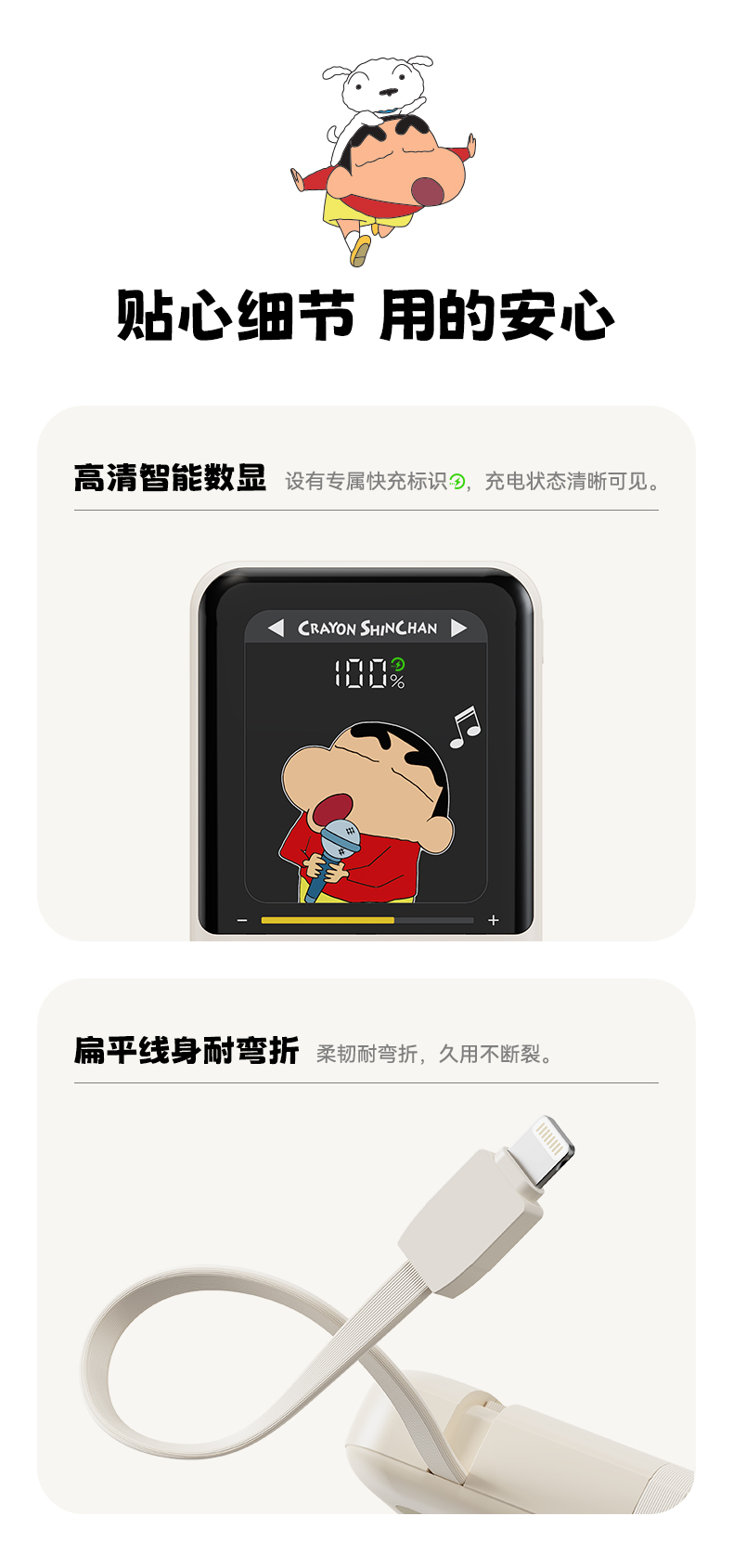 ROCK 蜡笔小新 自带双线PD 22.5W快充移动电源 P65 10000mAh 米白色(单位:个)