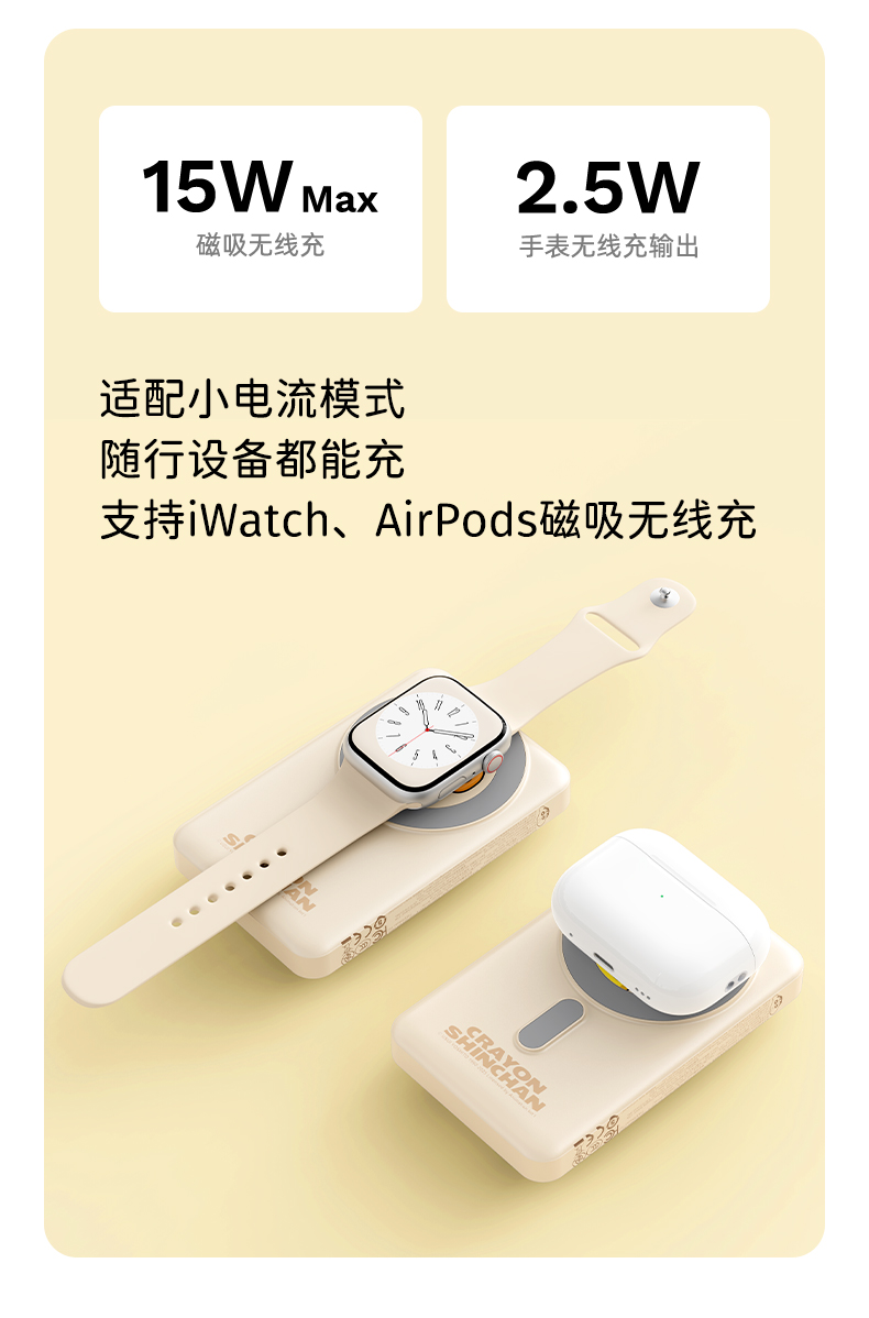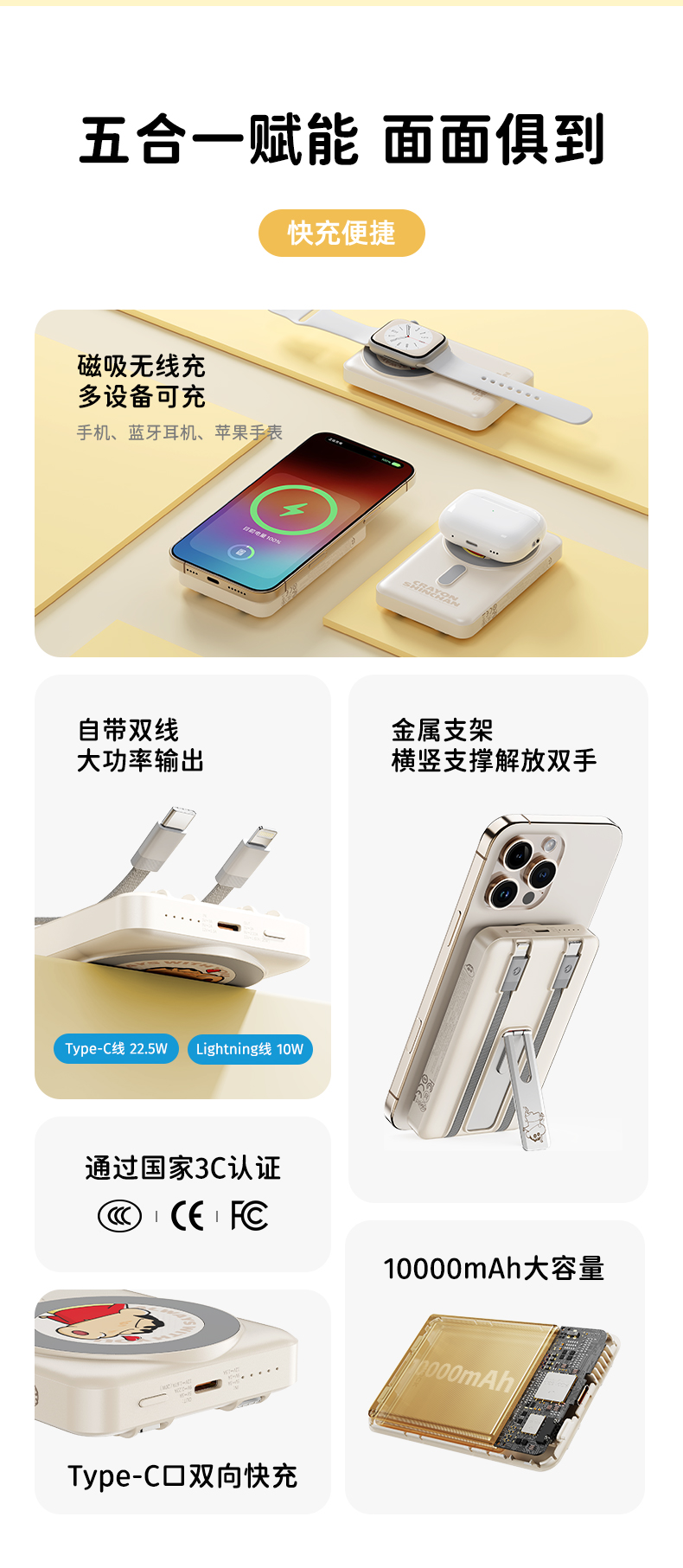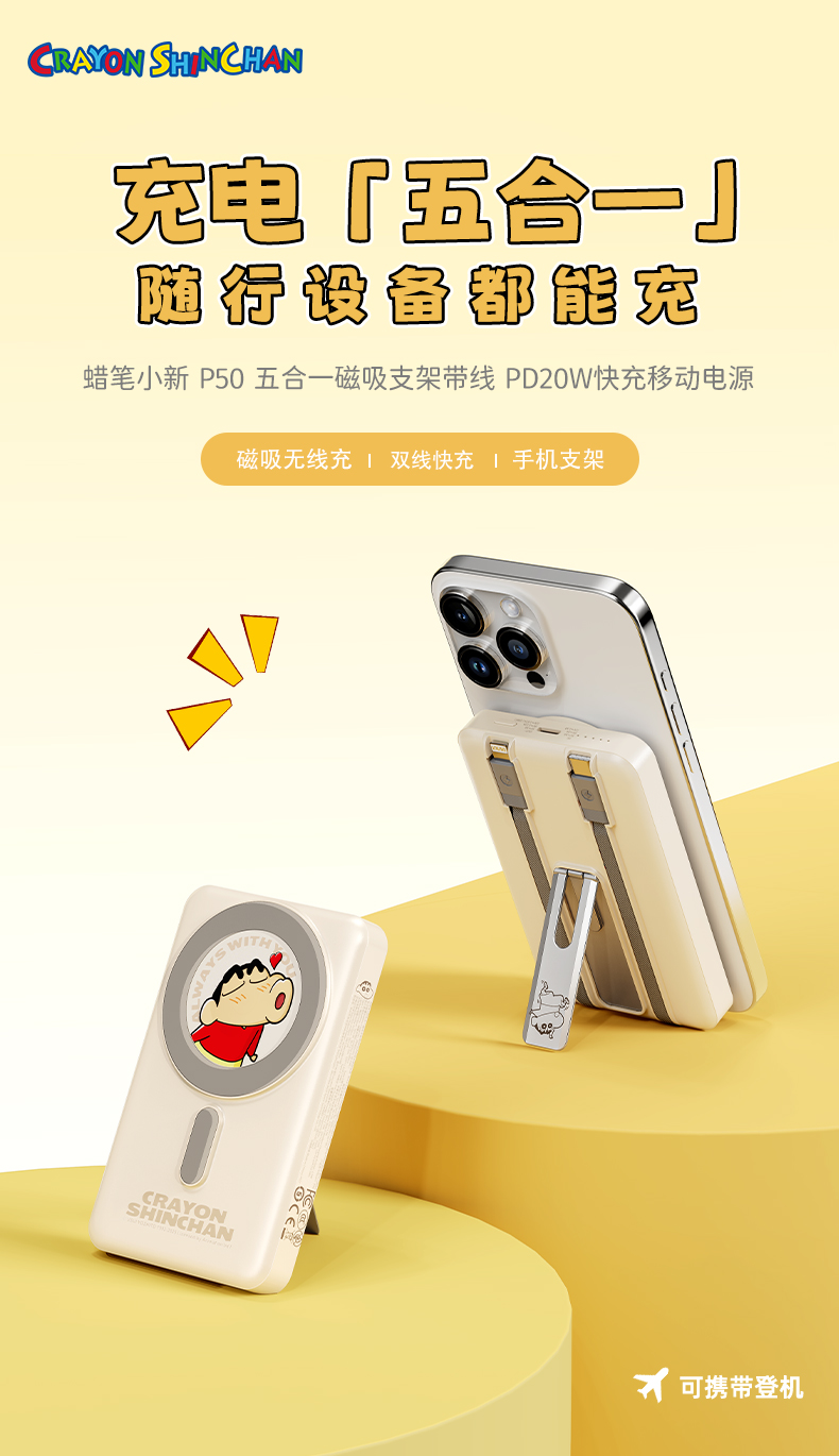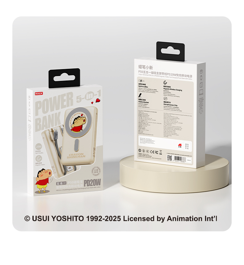 ROCK 蜡笔小新 P50五合一磁吸支架带线PD20W快充移动电源 P50 10000mAh 米白色(单位:个)