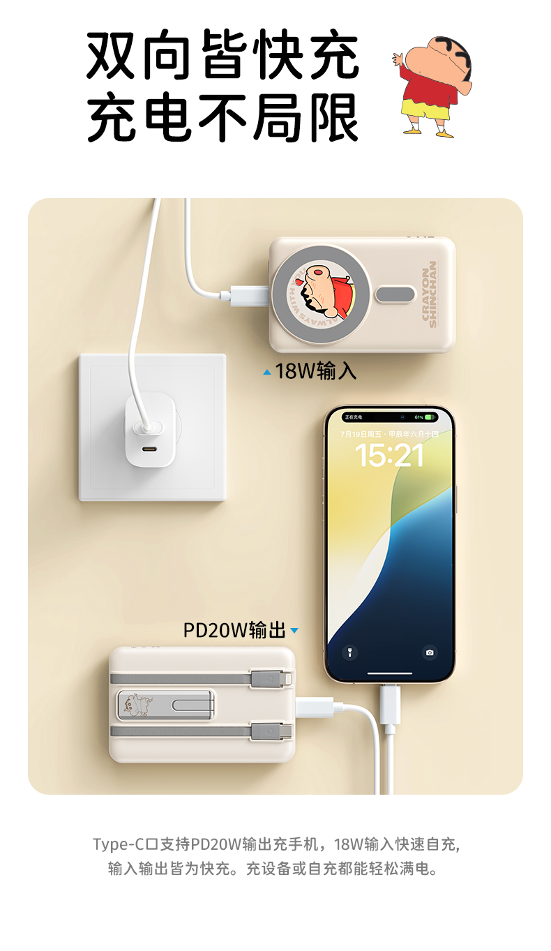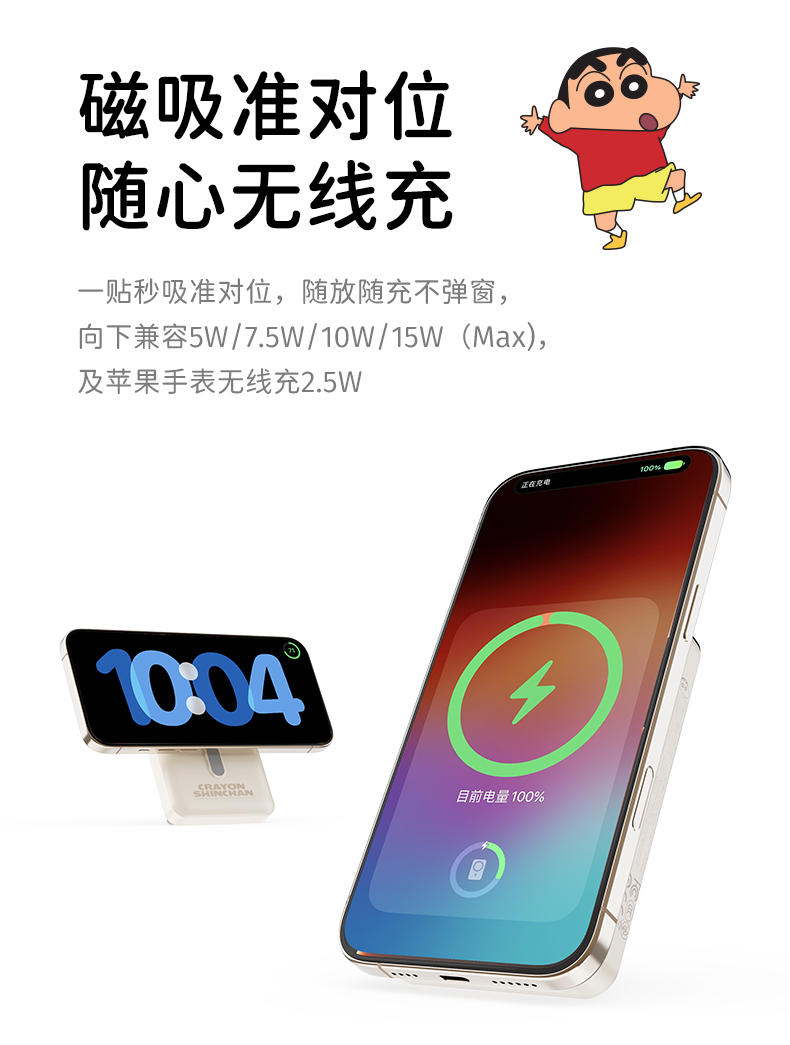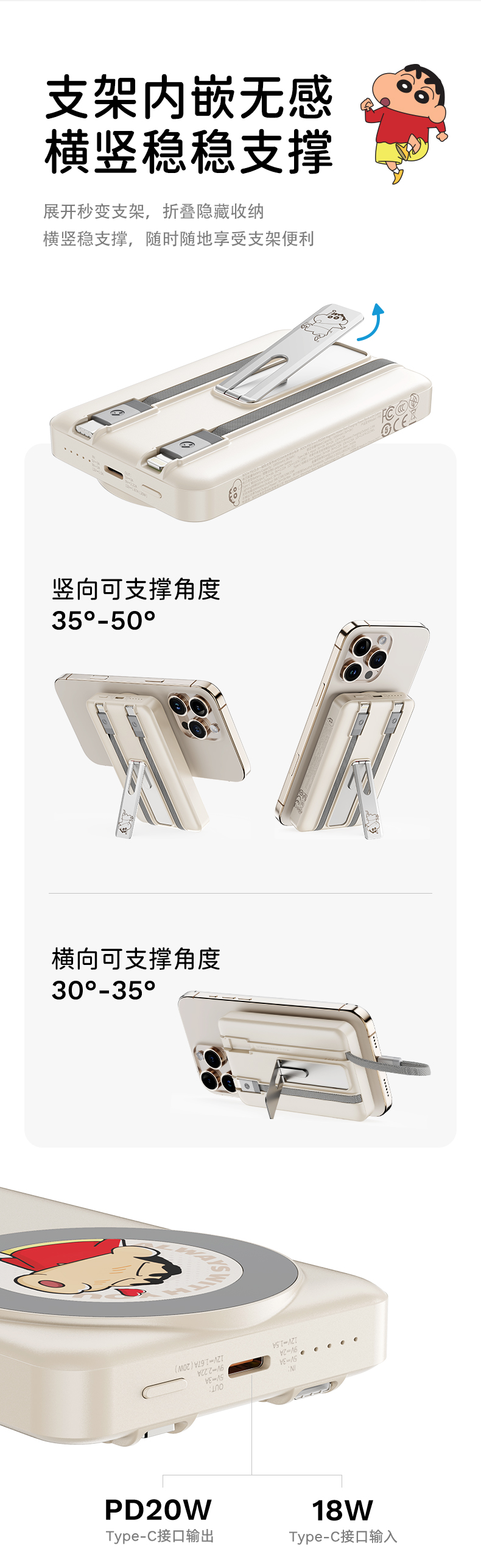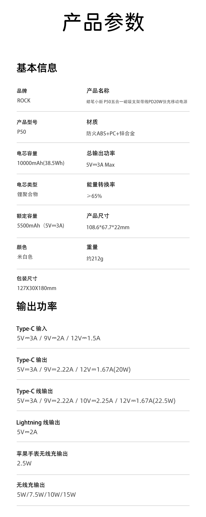 ROCK 蜡笔小新 P50五合一磁吸支架带线PD20W快充移动电源 P50 10000mAh 米白色(单位:个)