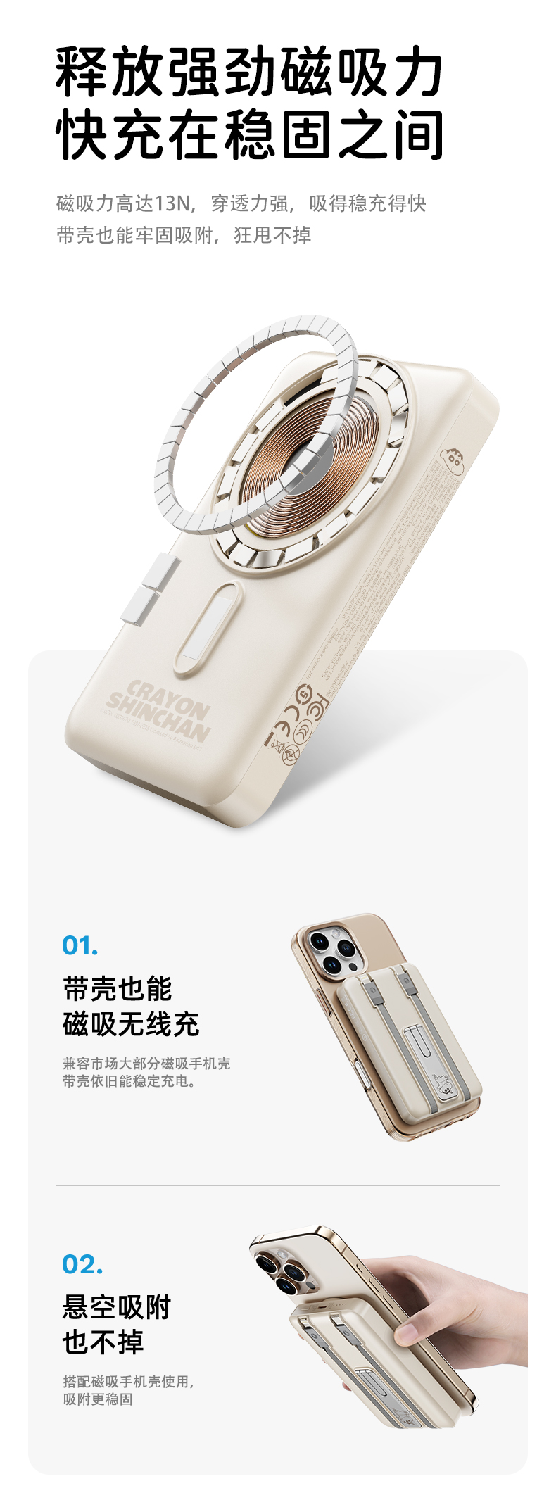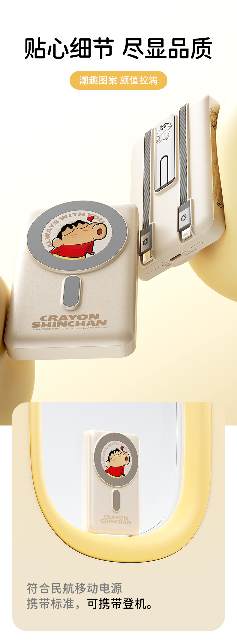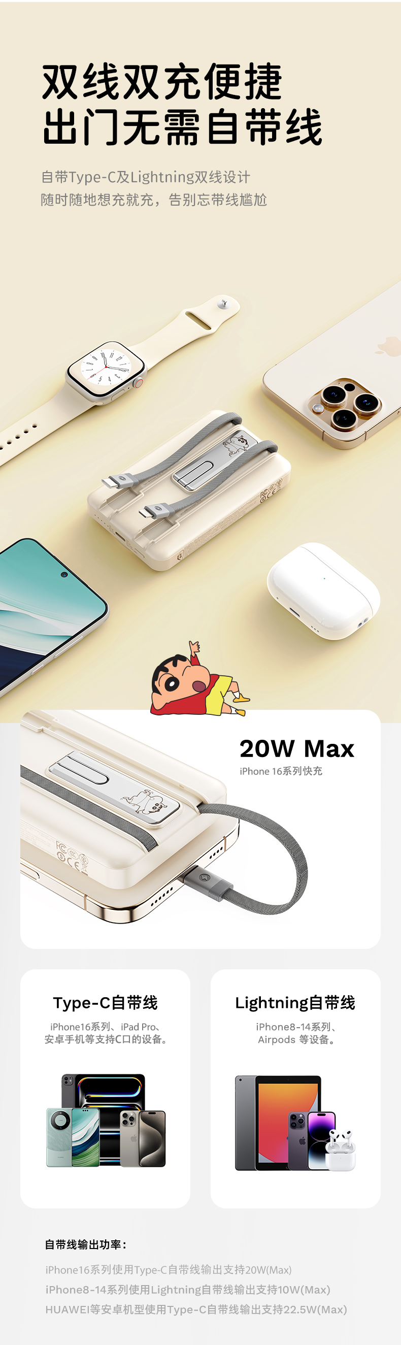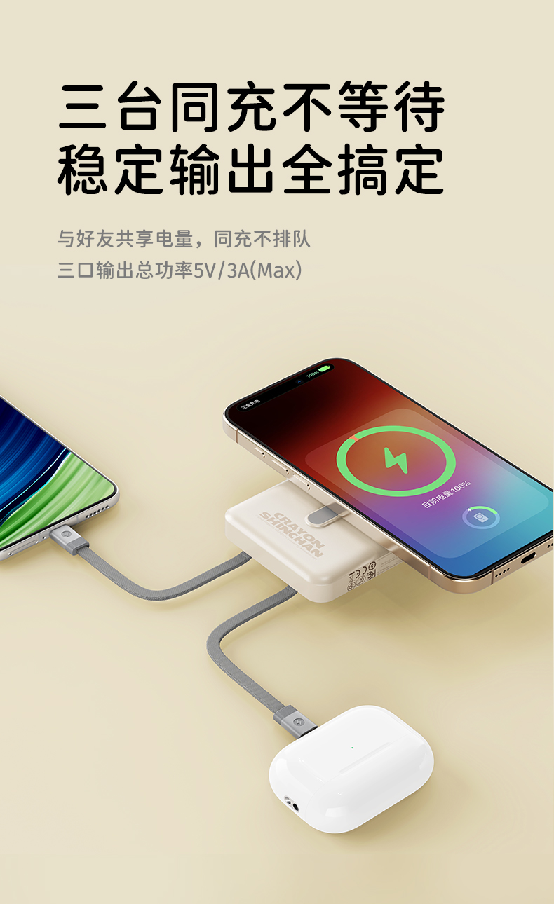 ROCK 蜡笔小新 P50五合一磁吸支架带线PD20W快充移动电源 P50 10000mAh 米白色(单位:个)