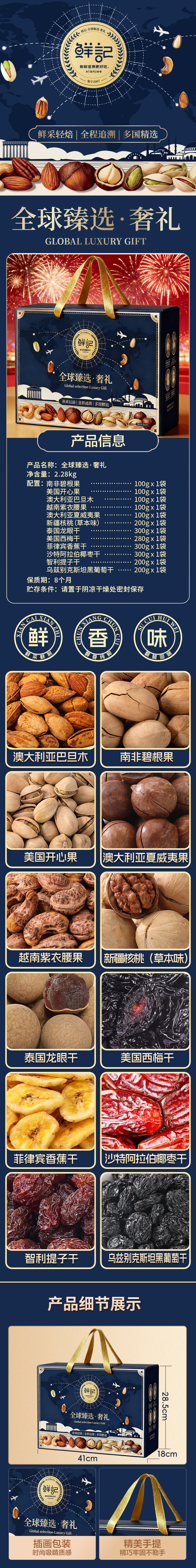 鲜记 坚果炒货蜜饯休闲零食 全球臻选奢礼 2.28kg*1盒 混色(单位:盒)