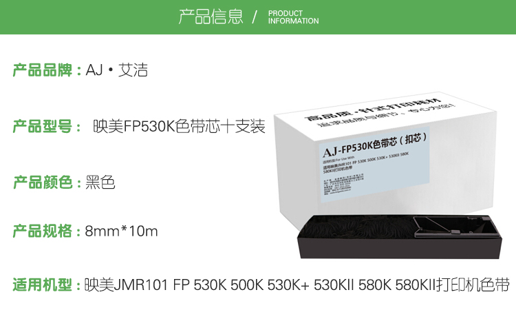 艾洁(AJ) FP530K十支装 打印量8mm*10m 适用映美JMR101 FP 530K 500K 530K+ 530KII 580K 580KII打印机 色带 (计价单位:盒) 黑色