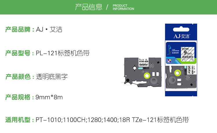 艾洁(AJ) PL-121 打印量9mm*8m 适用PT-1010;1100CH;1280;1400;18R TZe-121标签机色带 标签色带 1.00 个/盒 (计价单位:盒) 黑色
