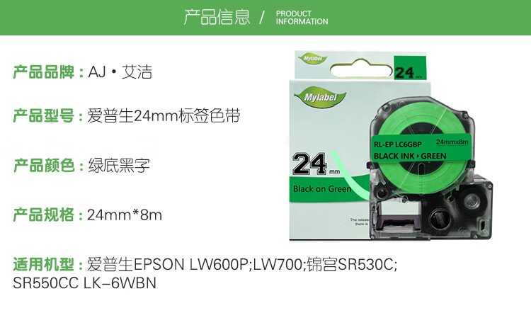艾洁(AJ) LK-6GBP 24mm*8m 适用爱普生EPSON LW600P;LW700;锦宫SR530C;SR550CC 标签色带 1.00 个/盒 (计价单位:盒) 绿底黑字