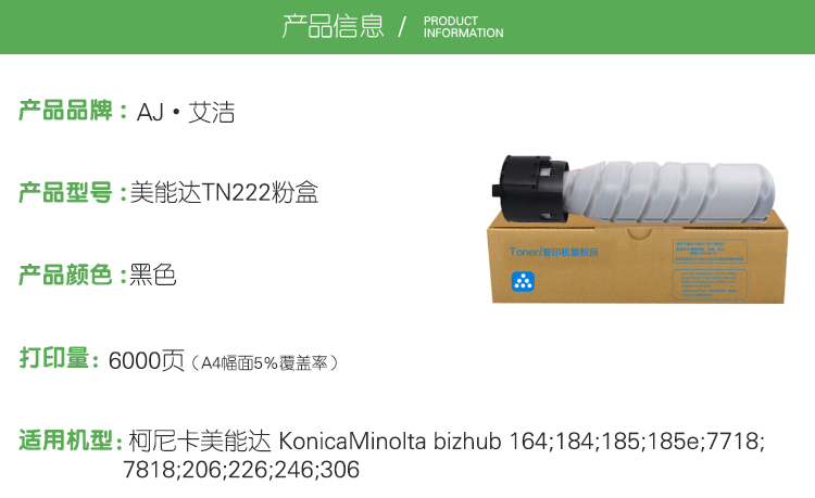 艾洁(AJ) TN222 打印量6000页 适用柯尼卡美能达 bizhub 164/184/185/185e/7718/7818/206 粉盒 (计价单位:只) 黑色 黑色