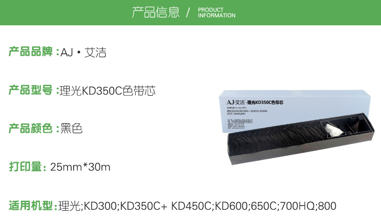 艾洁(AJ) KD350C 打印量25mm*30m 适用理光/KD300/KD350C+ KD450C/KD600/650C/700HQ/800 色带芯 (计价单位:盒) 黑色