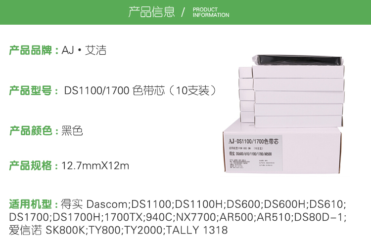 艾洁(AJ) DS1100 十支装 打印量12.7mmX12m 适用得实 Dascom/DS1100/DS1100H/DS600/DS600H/DS610/DS1700 色带 (计价单位:盒) 黑色
