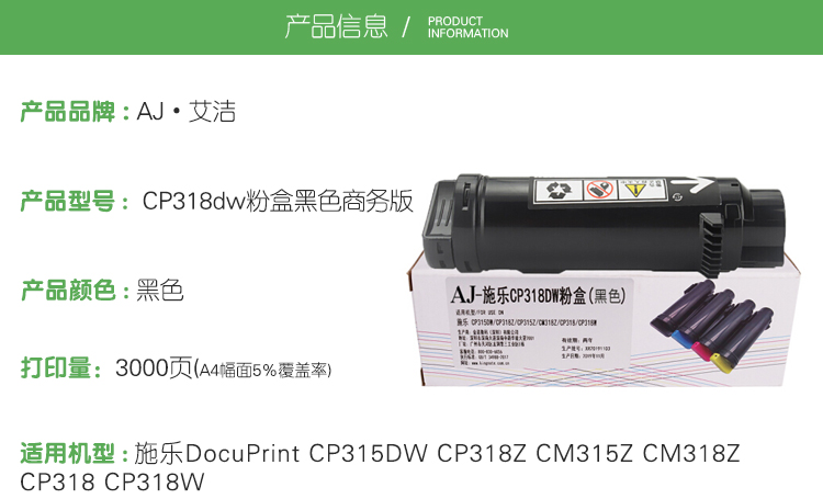 艾洁(AJ) CP318dw商务版 打印量3000页 适用施乐DocuPrint CP315DW CP318Z CM315Z CM318Z CP318 CP318W 粉盒 (计价单位:只) 黑色