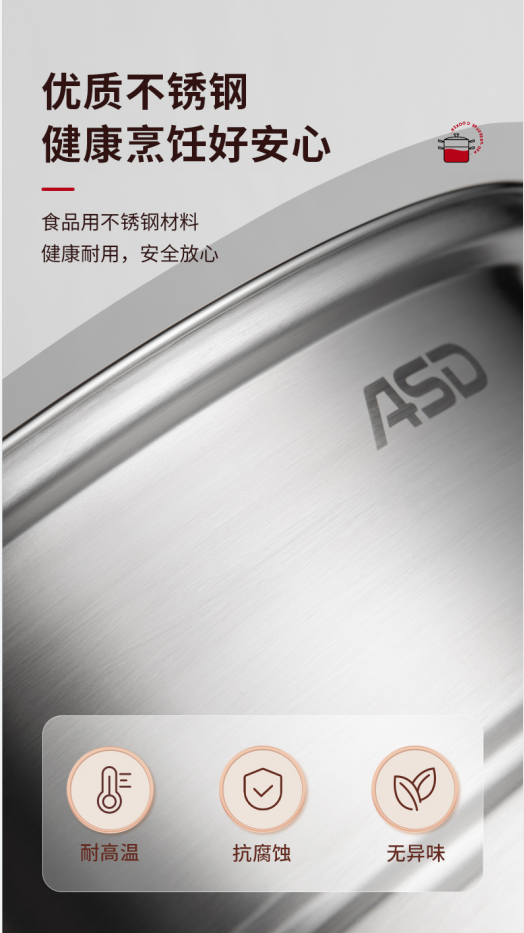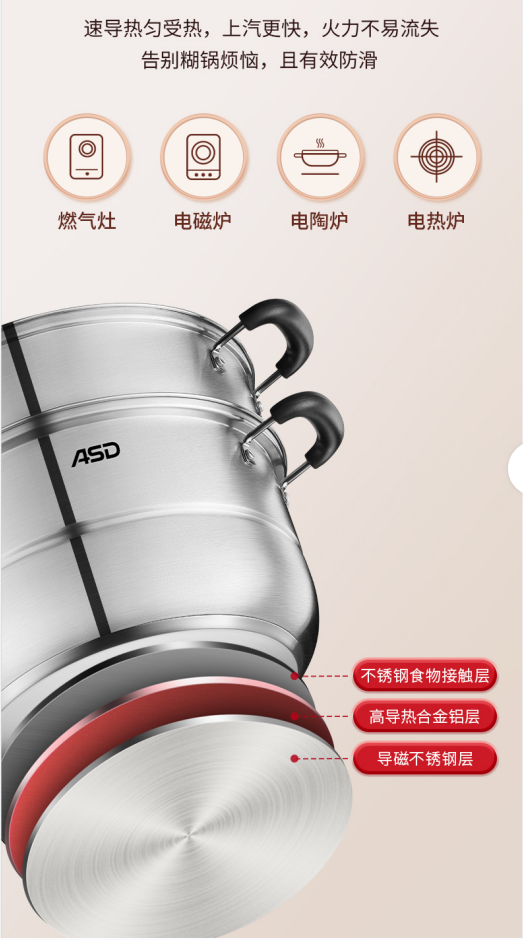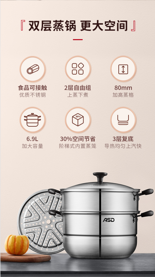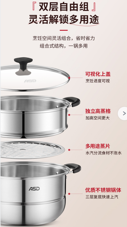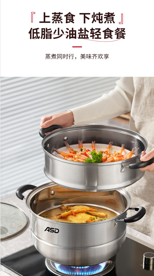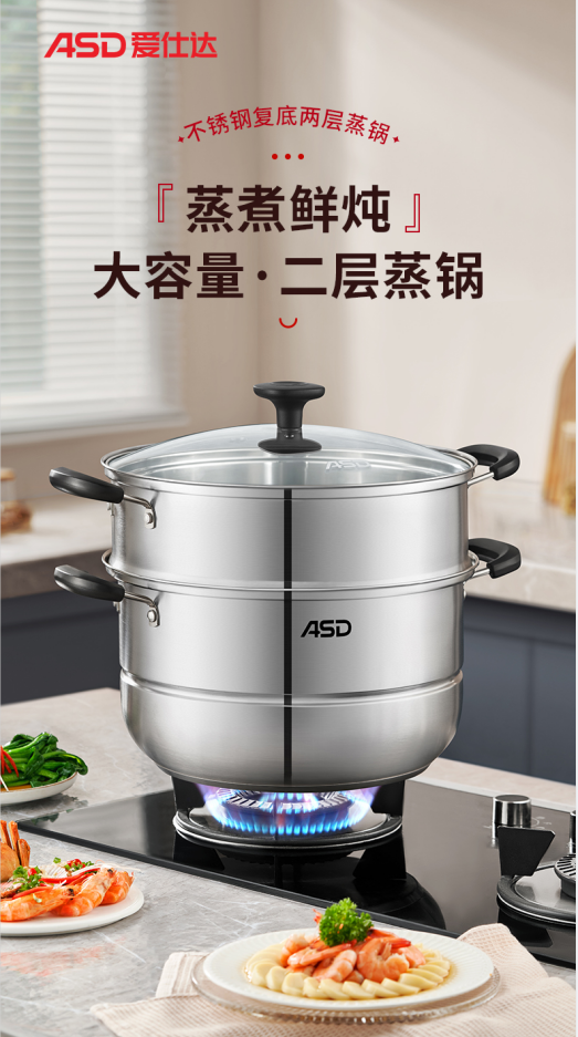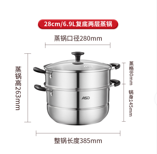 爱仕达(ASD)28cm不锈钢复底两层蒸锅QVL1528(单位:个) 银色