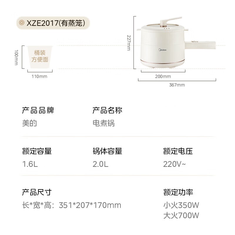 美的(Midea) MC-XZE2017 1.6L 多功能多用途 电蒸锅 白色(单位:个)