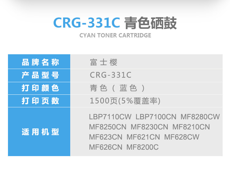 富士樱 CRG-331C 青色(蓝色)硒鼓 适用佳能LBP7110Cw LBP7100Cn 单位:支 蓝色