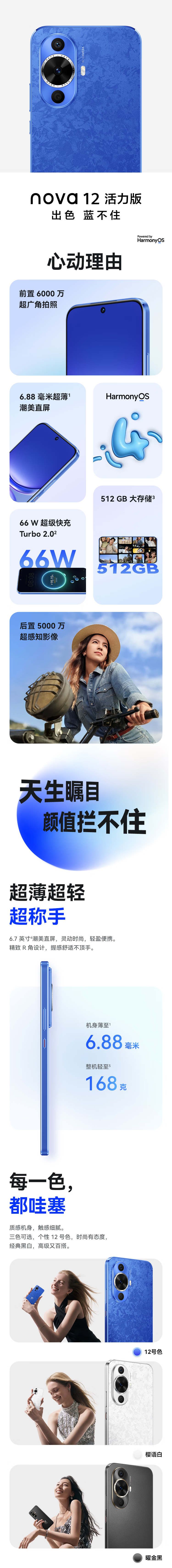华为(HUAWEI)nova 12活力版 6.88mm超薄潮美直屏(单位:台) 曜金黑 512G