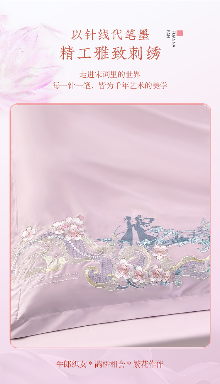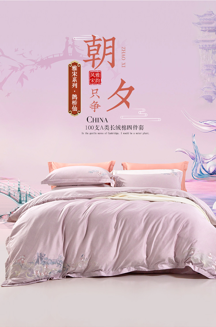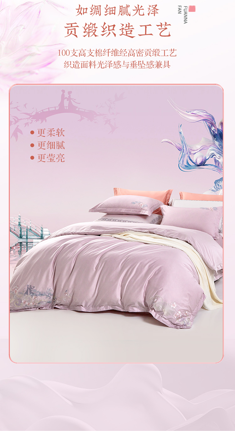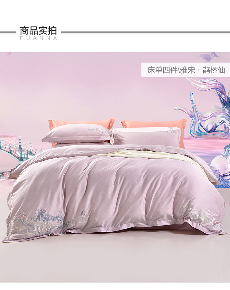 富安娜纯棉四件套100s长绒棉贡缎床单被套全棉A类套件230*229cm 雅宋·鹊桥仙(单位:套) 紫色