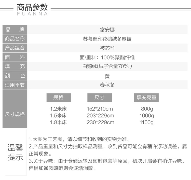 富安娜白鹅绒羽绒被子 苏幕遮羽绒冬被芯1000g填充70白鹅绒(单位:床) 黄色 203*229cm