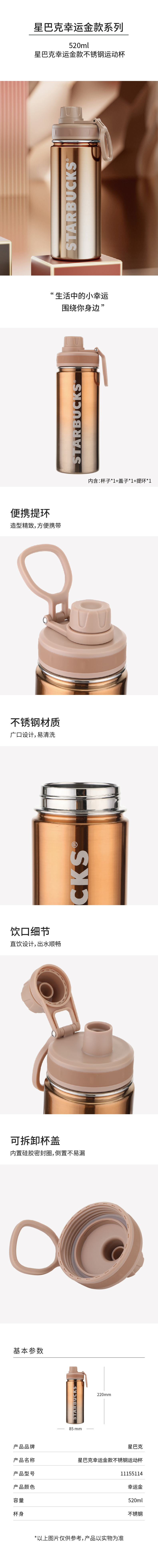 星巴克(Starbucks)幸运金款不锈钢运动杯520ml 11155114(个) 咖啡色