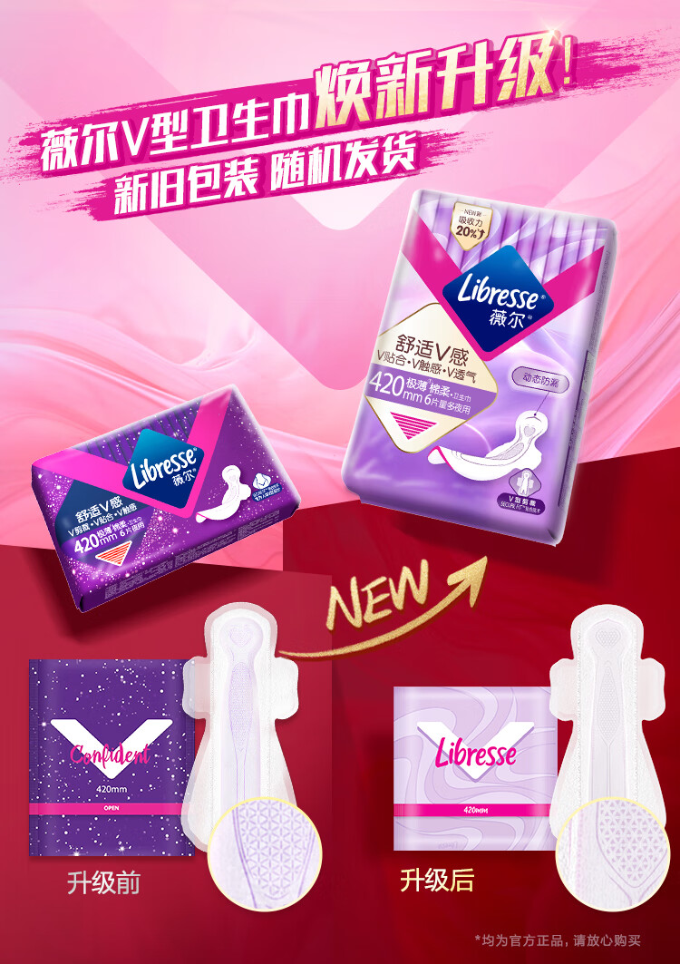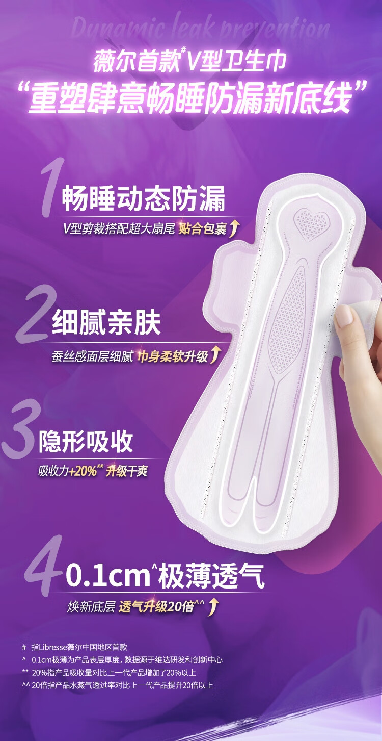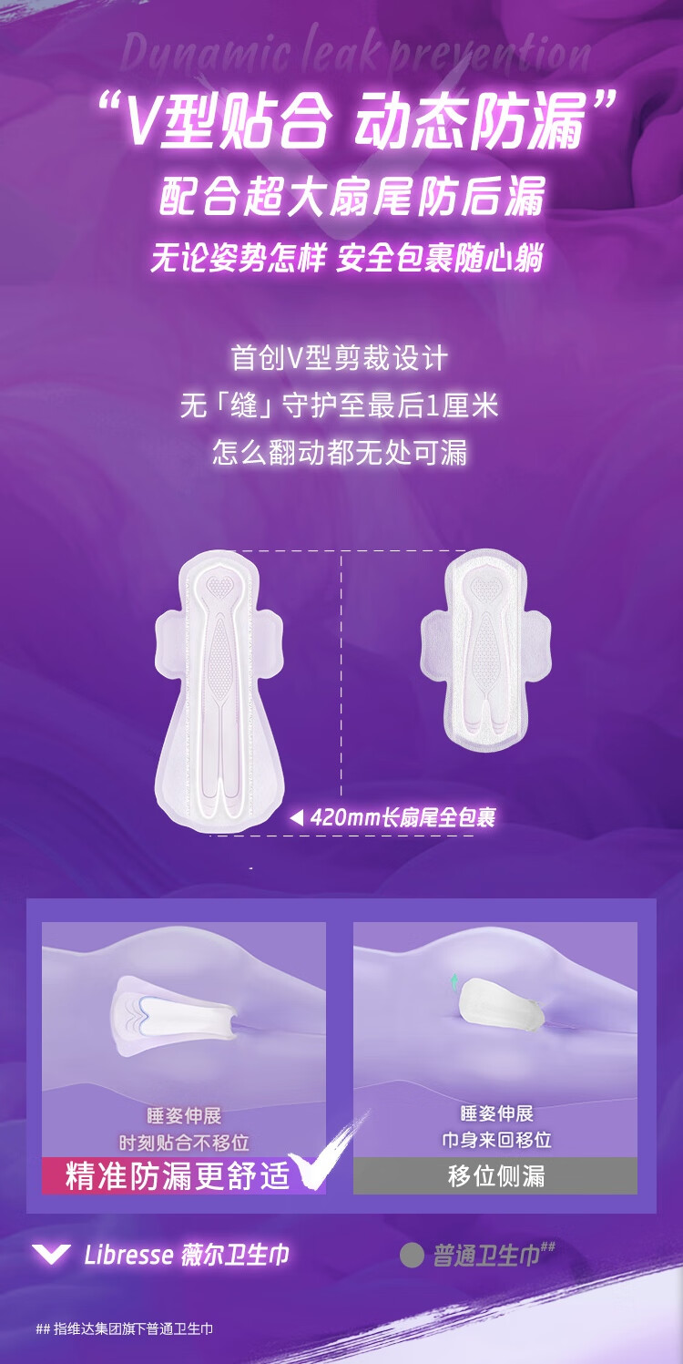 薇尔卫生巾姨妈巾 夜用卫生巾V感系列420mm超强吸收不侧漏棉柔亲肤6片(单位:包) 佳人粉