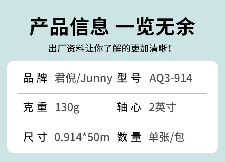 君倪(Junny)AQ3-914户内水性背胶130g 0.914*50米/卷 高清喷绘卷筒纸(单位:卷) 白色