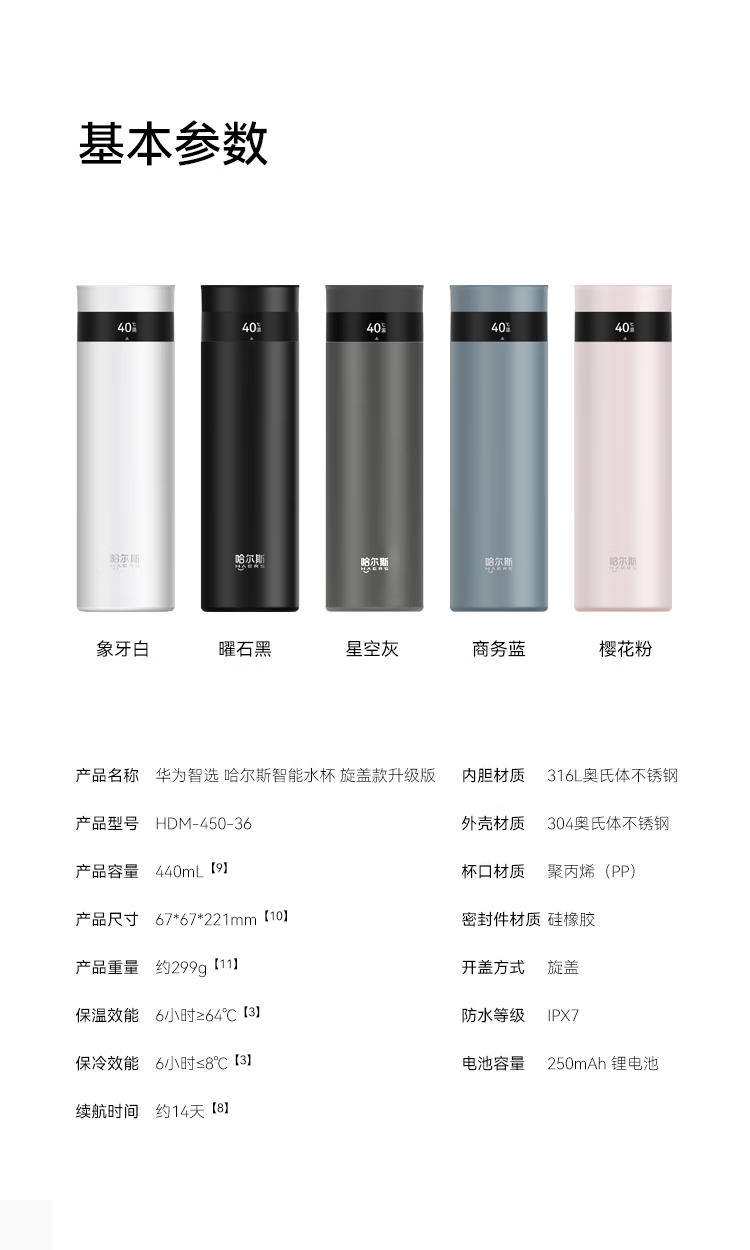 华为智选 哈尔斯智能水杯 旋盖款(升级版) HDM-450-36 440ml(单位:个) 白色