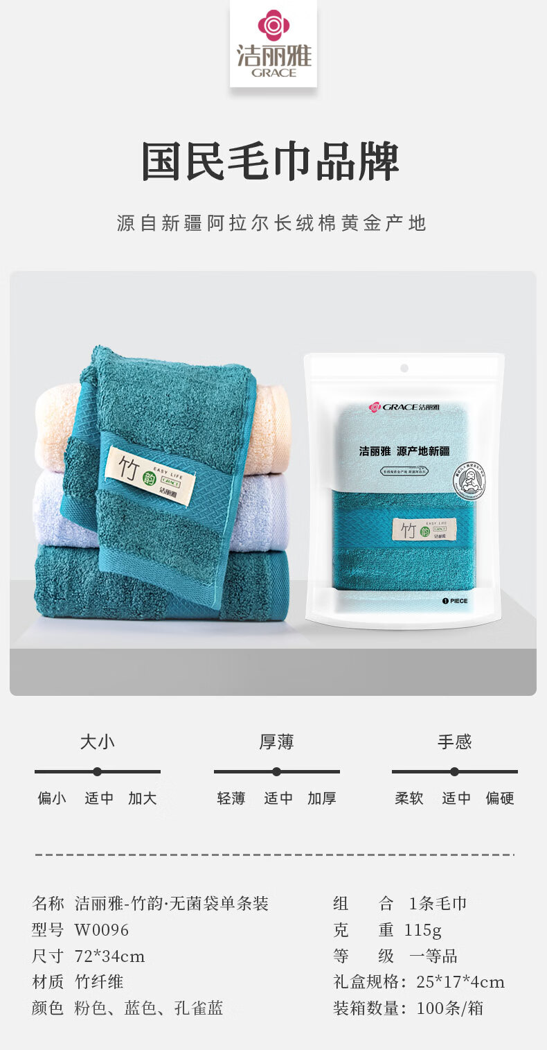 洁丽雅(Grace) 竹韵面巾 W0096 72*34cm/115g 混色(单位:袋)