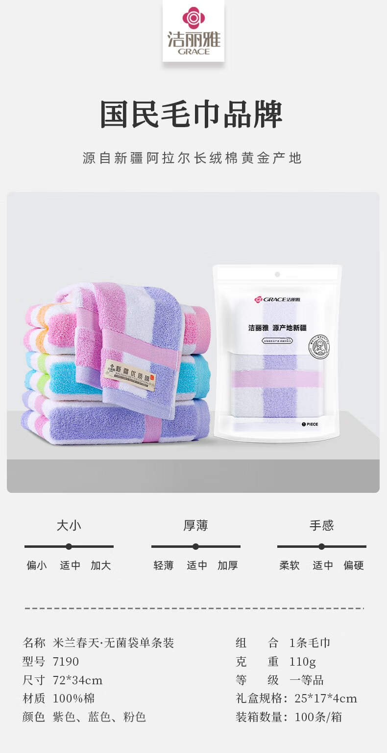 洁丽雅(Grace) 米兰春天毛巾 7190 72*34cm /110g 混色(单位:袋)