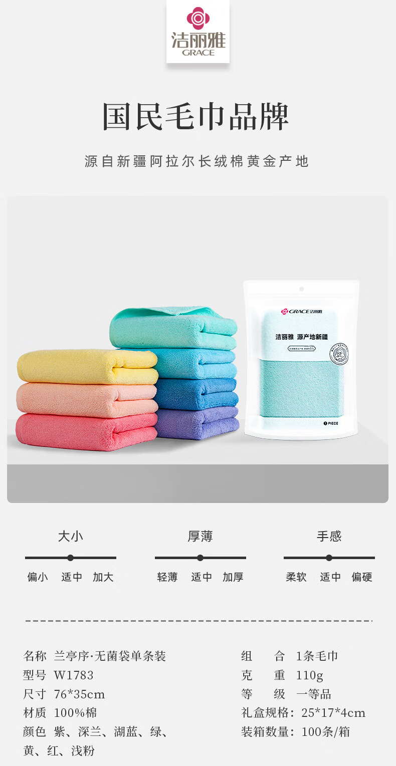 洁丽雅(Grace) 兰亭序毛巾 W1783 76*35cm/110g 混色(单位:袋)