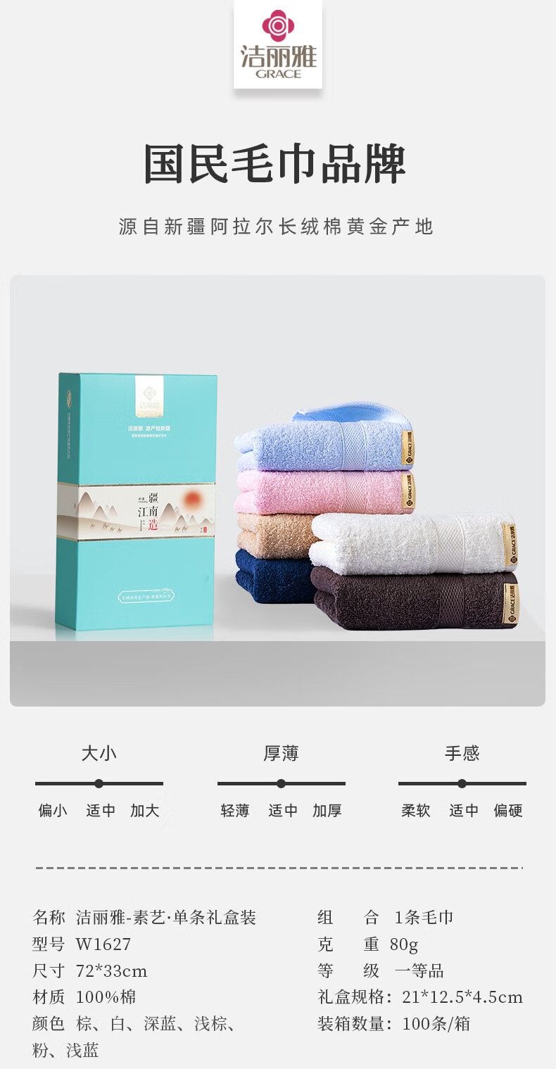 洁丽雅(Grace) 素艺毛巾 W1627 72*33cm /80g 混色(单位:盒)
