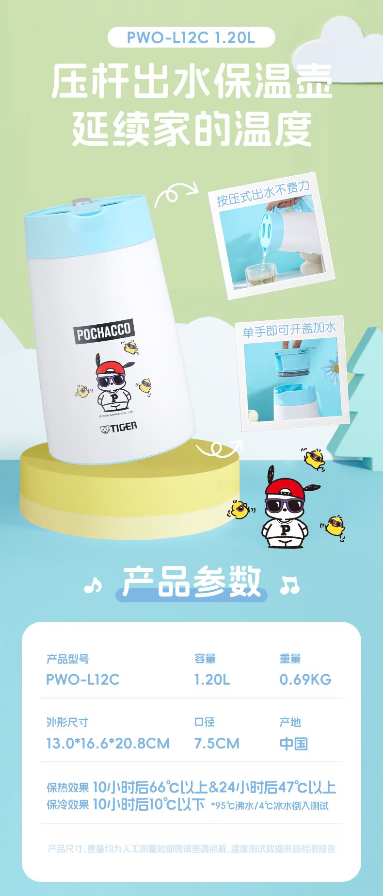 虎牌(TIGER) 不锈钢保温壶 PWO-L12C-帕恰狗 1.2L 天蓝色(单位:个)