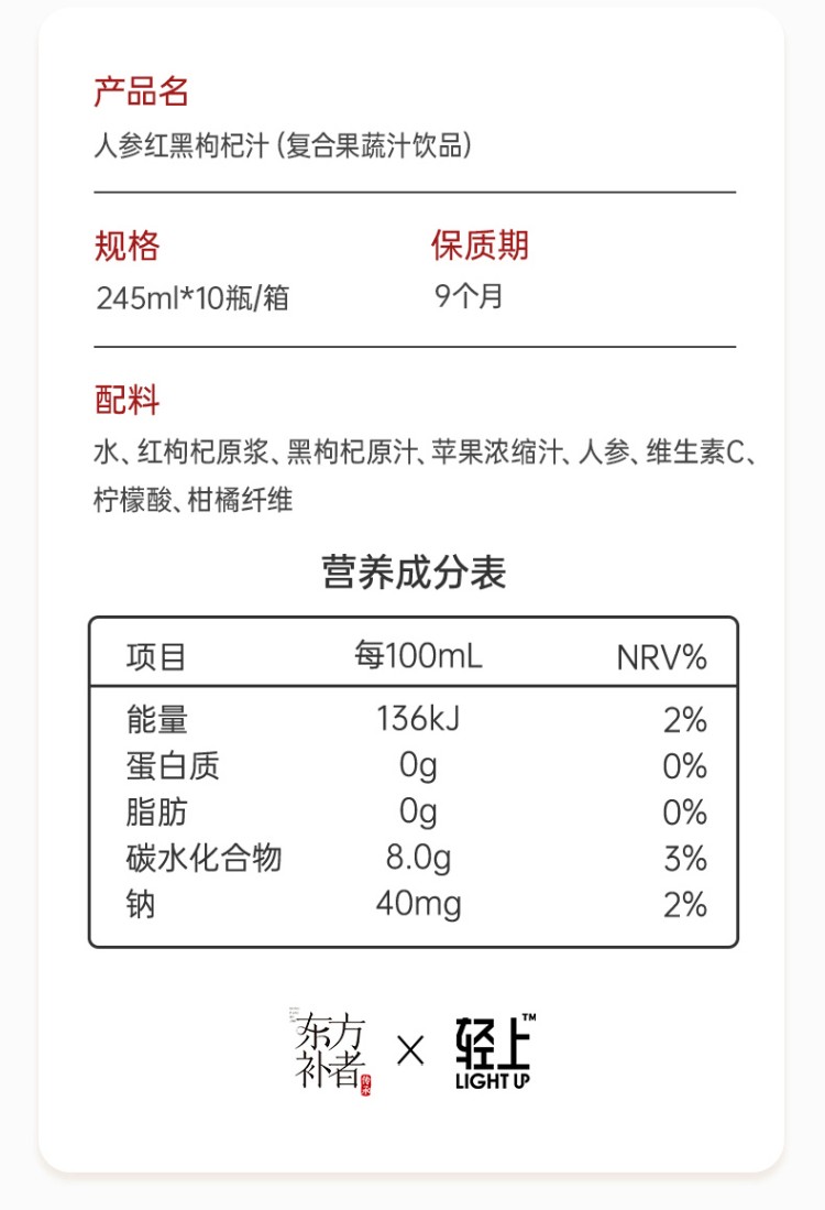 轻上(LIGHT UPPER) 东方补者人参红黑枸杞汁 饮品 245ml*10瓶 枫叶色(单位:组)