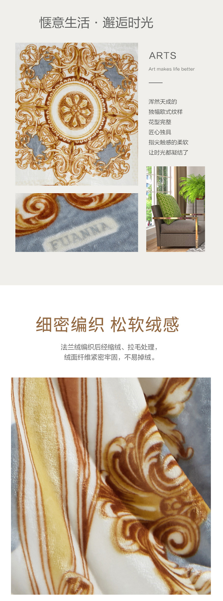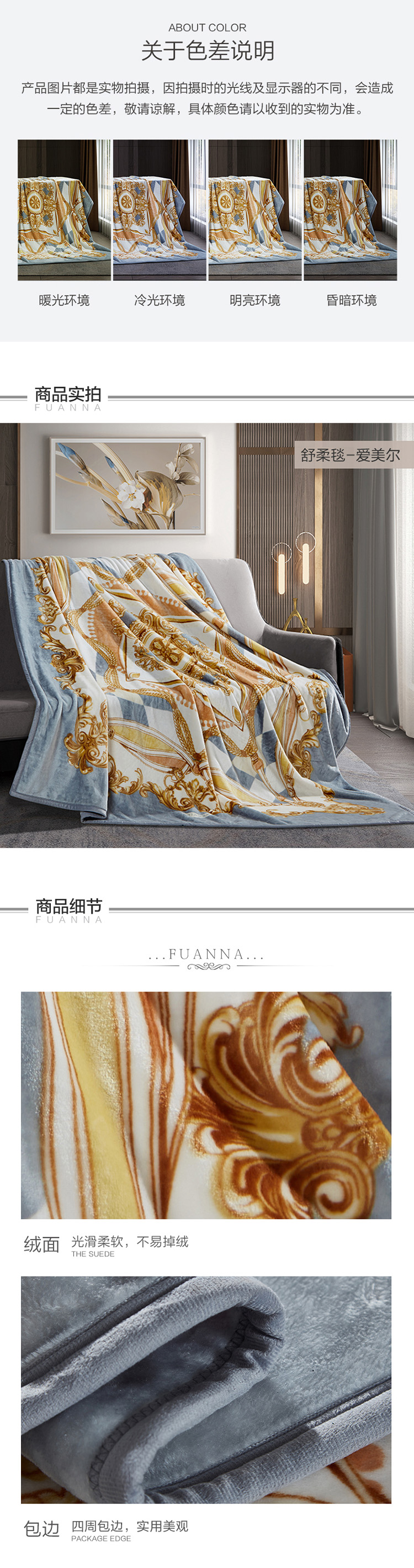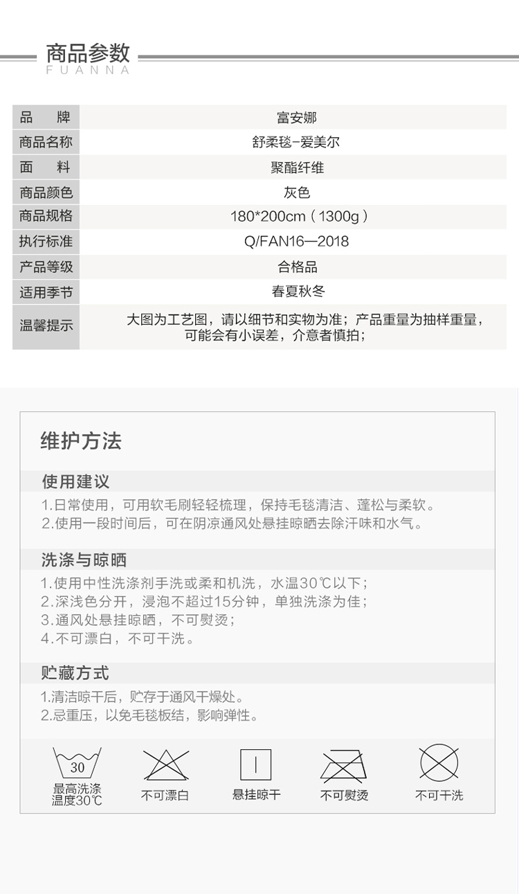富安娜 家纺 爱美尔毛毯 180*200cm 灰色(单位:个)